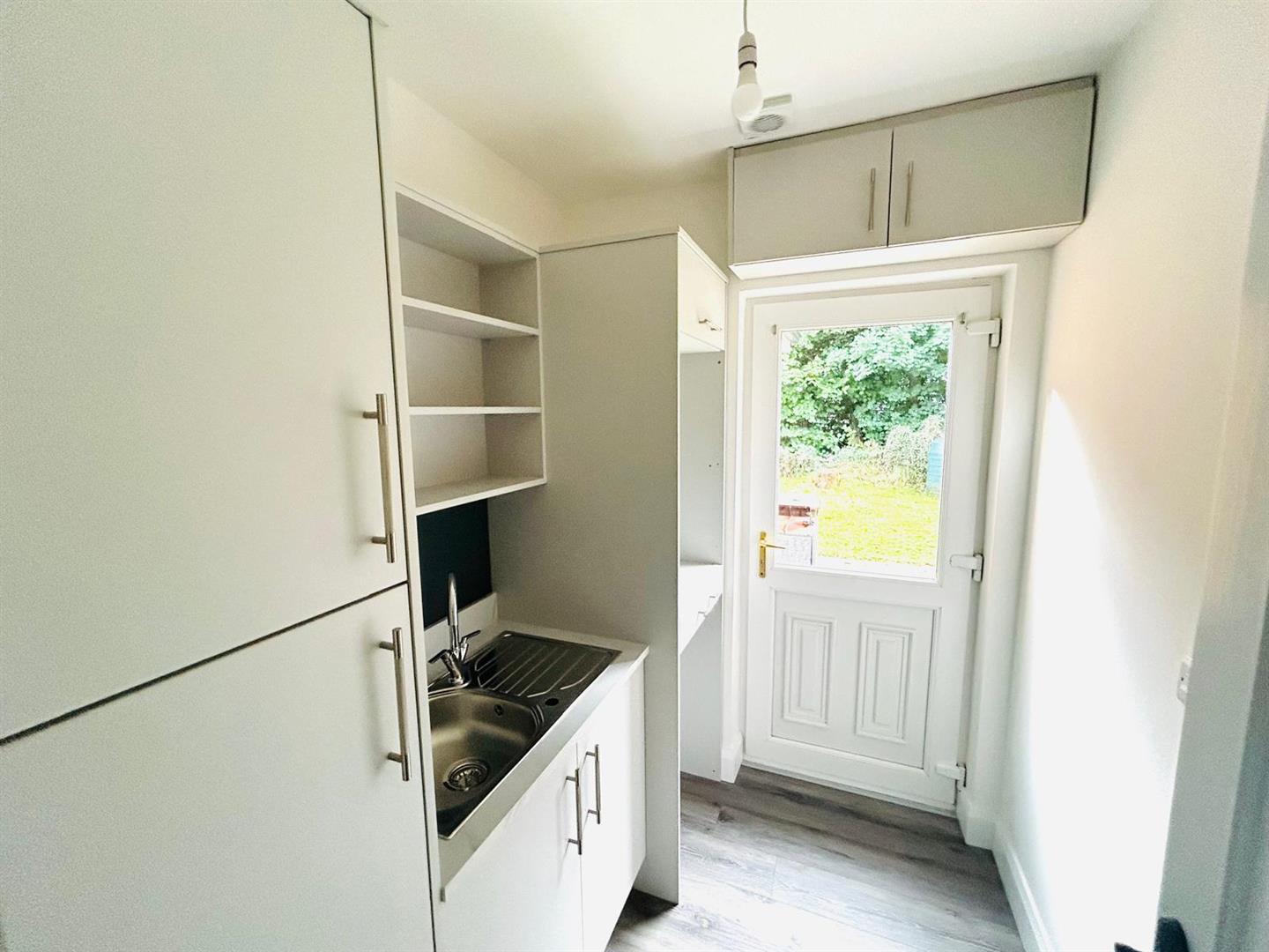 2.21m x 1.73m (7'3" x 5'8") - Having low level units, single drainer stainless steel sink unit with mixer taps, eye level shelving, larder, housing unit for washing machine and tumble dryer.