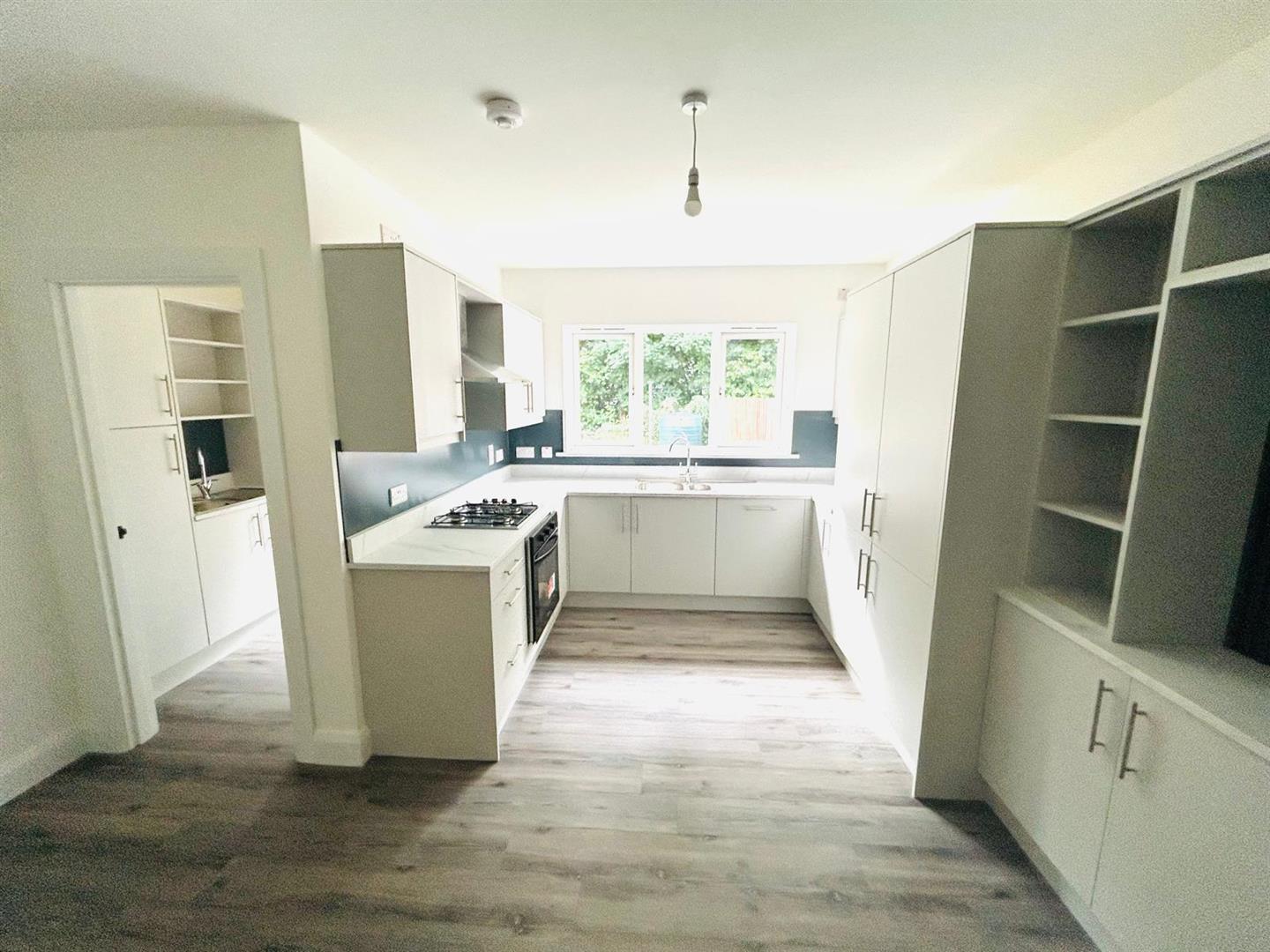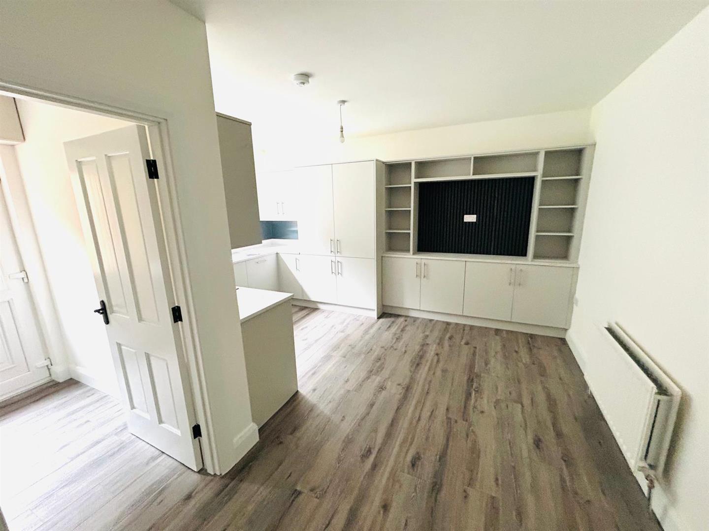 4.50m x 3.99m wp (14'9" x 13'1" wp) - Having eye and low level units, 1 1/2 bowl stainless steel sink unit with mixer taps, gas hob, electric underoven, integrated fridge/freezer and dishwasher, media wall with shelving and cupboards under, laminated wooden floor.