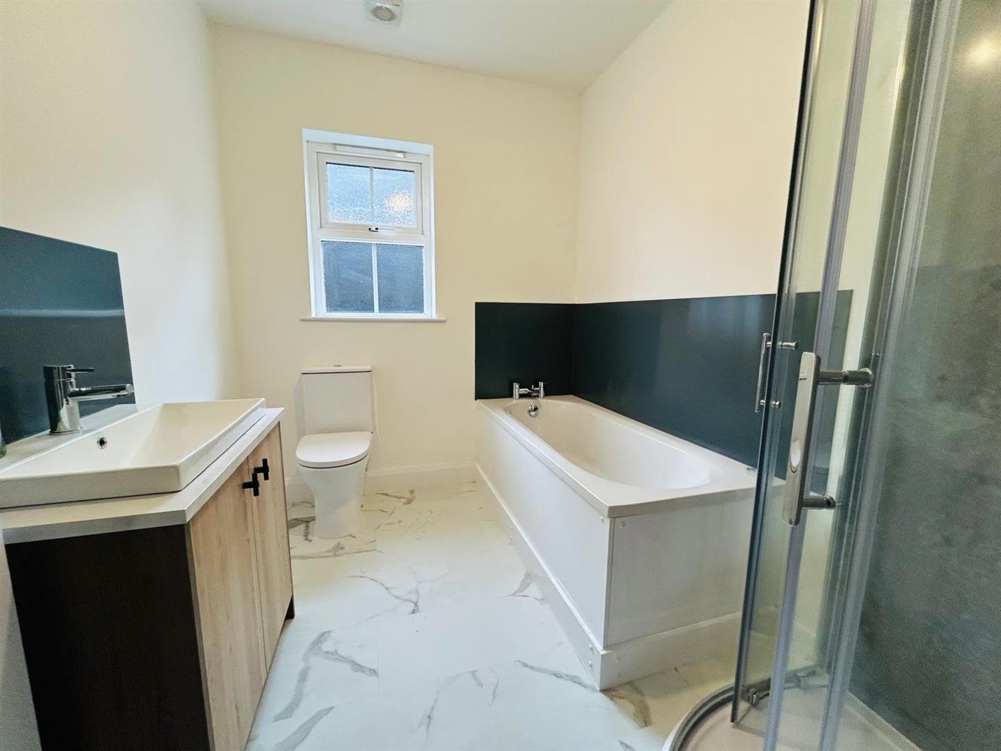 Comprising bath with mixer taps, whb with mixer taps and storage under, wc, electric shower with PVC cladding, laminated wooden floor.