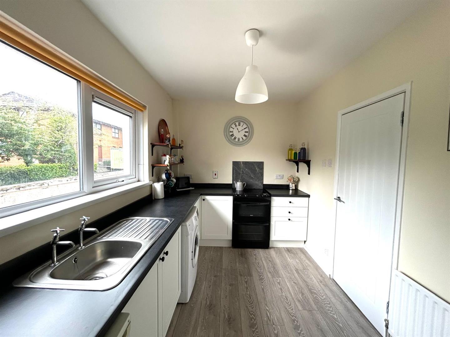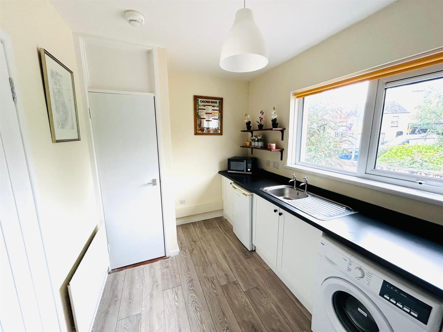 3.91m x 2.34m wp (12'10" x 7'8" wp) - Having low level units, single drainer stainless steel sink unit, wired for cooker, plumbed for washing machine, space for fridge, storage cupboard, laminated wooden floor.