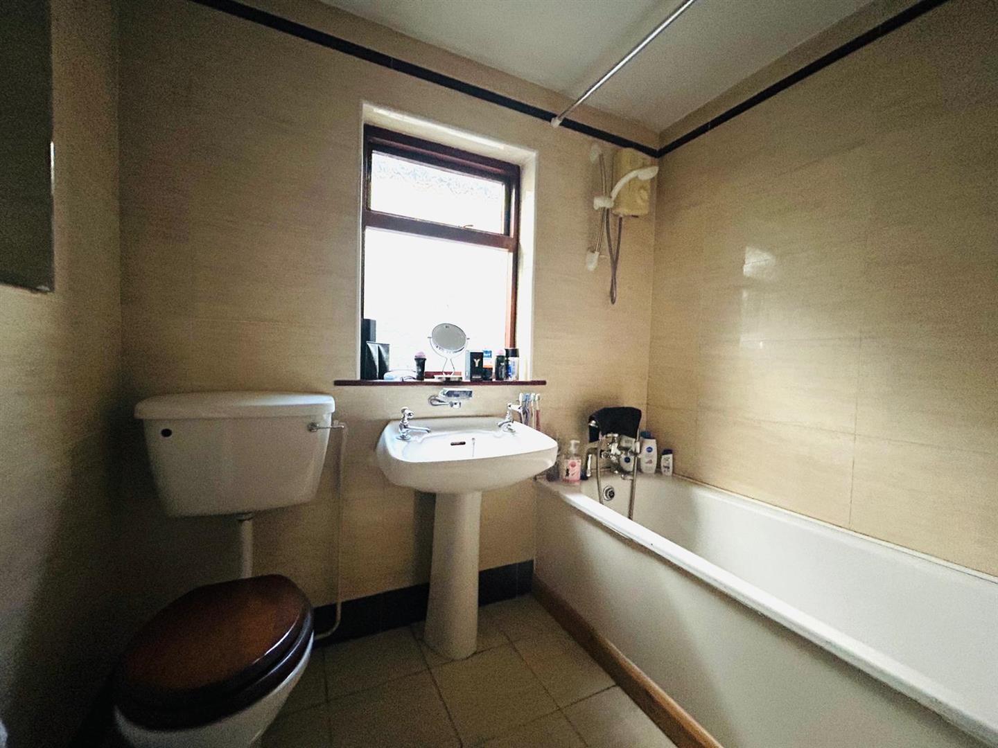 Comprising bath with shower attachment to taps, electric shower over, whb and wc, fully tiled walls, tiled floor.