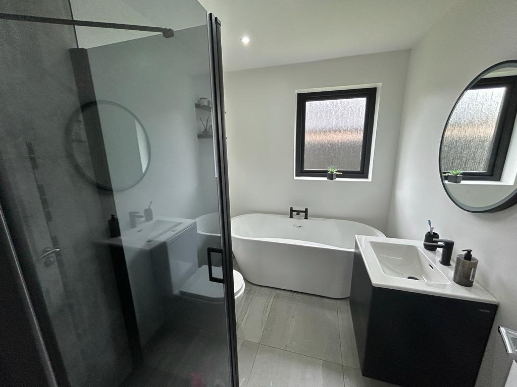 Comprising bath with mixer taps, whb vanity unit, wc, walk in electric shower with PVC cladding to walls, recessed lighting, tiled floor.