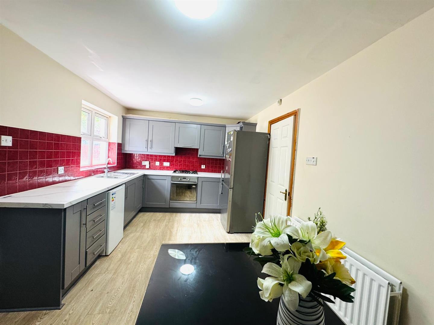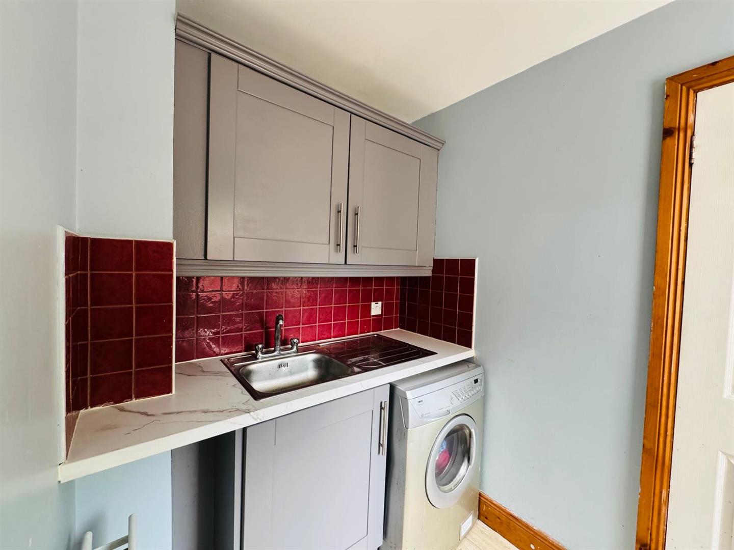 Having eye level units, sink unit, plumbed for washing machine.