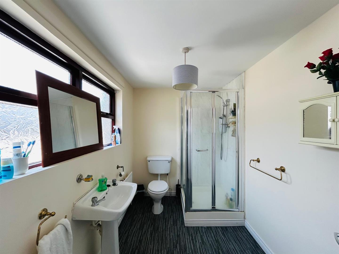 Comprising walk in electric shower with PVC cladding to walls, whb and wc.