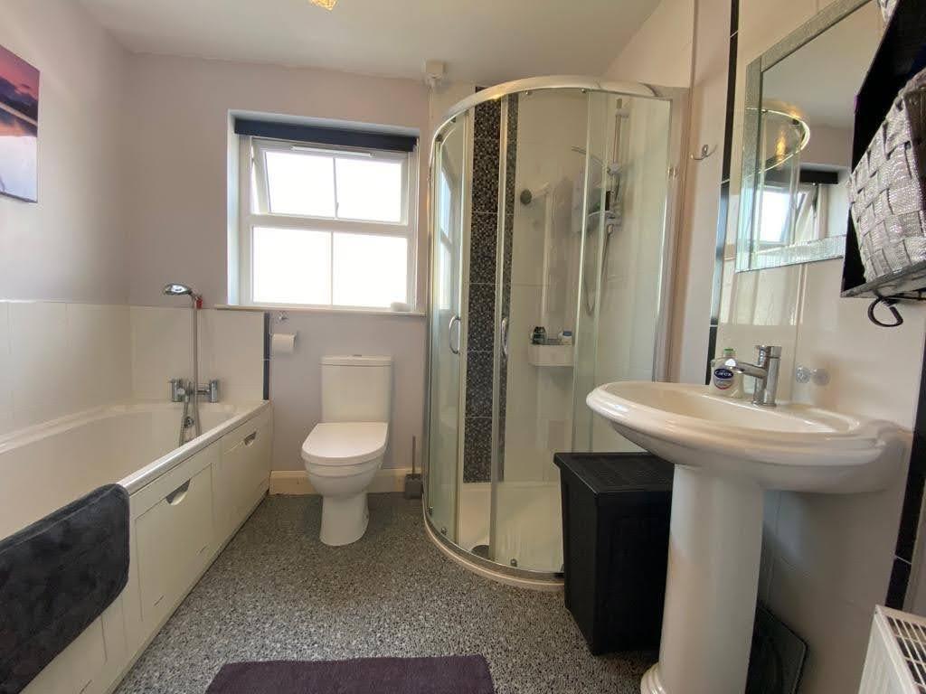 Comprising bath with telephone hand shower attachment to taps, fully tiled walk in electric shower, whb and wc.