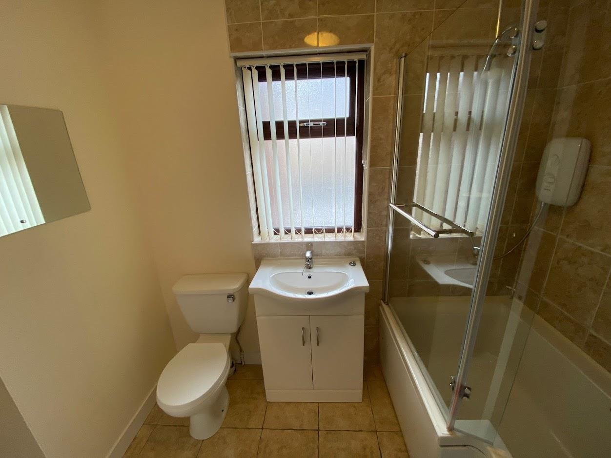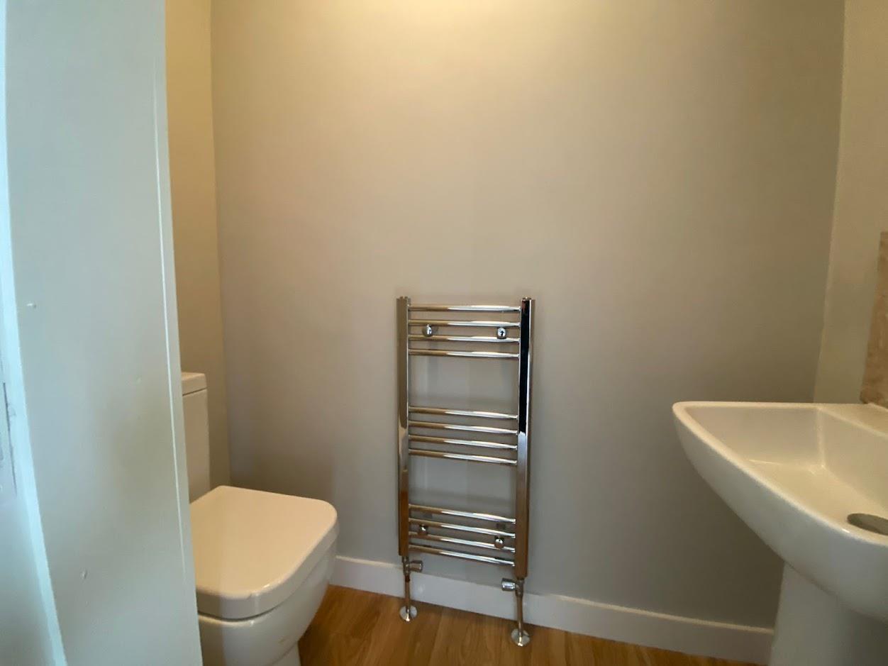 Having whb with tiling aaround, wc, chrome heated towel rail, extractor fan, laminated wooden floor.