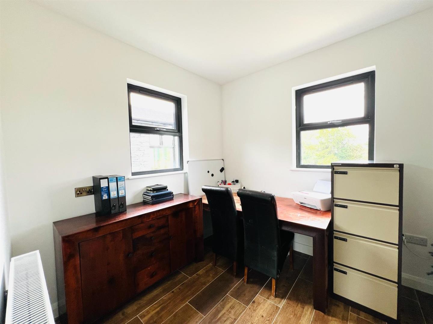 Having half height wooden panelled walls, feature Victorian style radiator, laminated wooden floor.