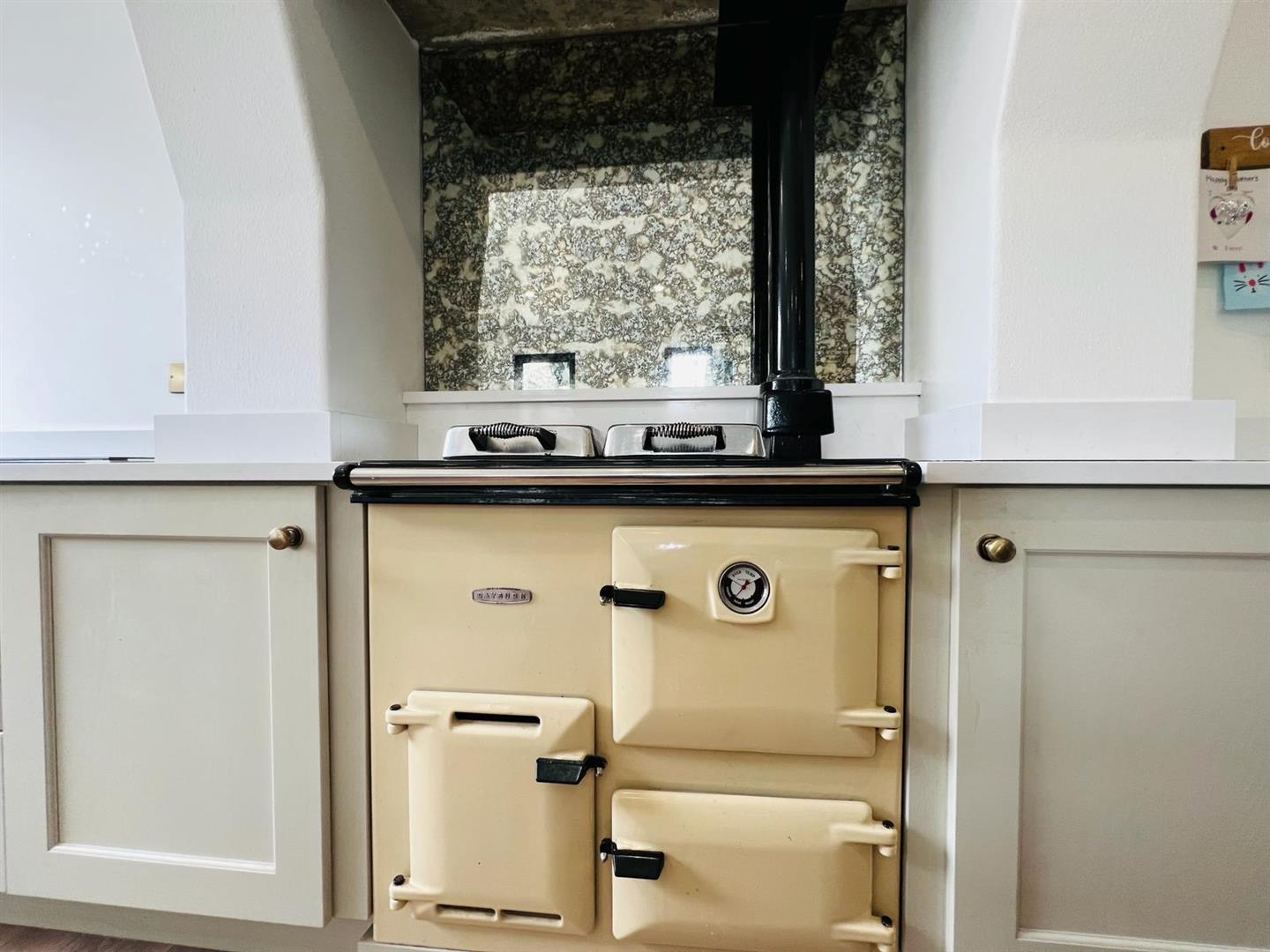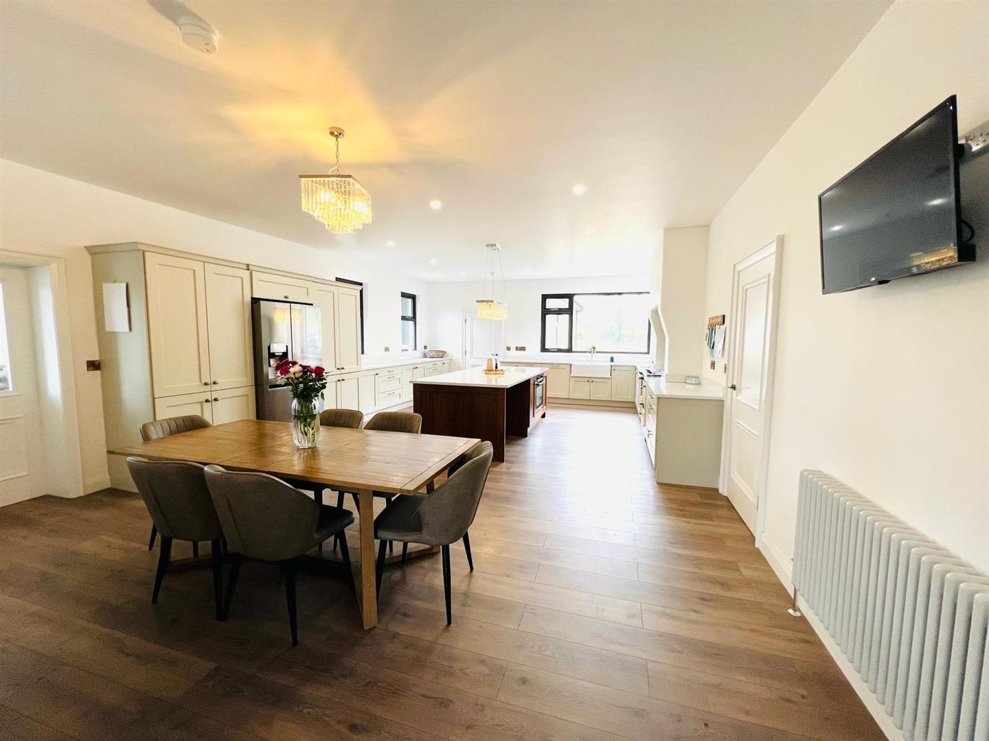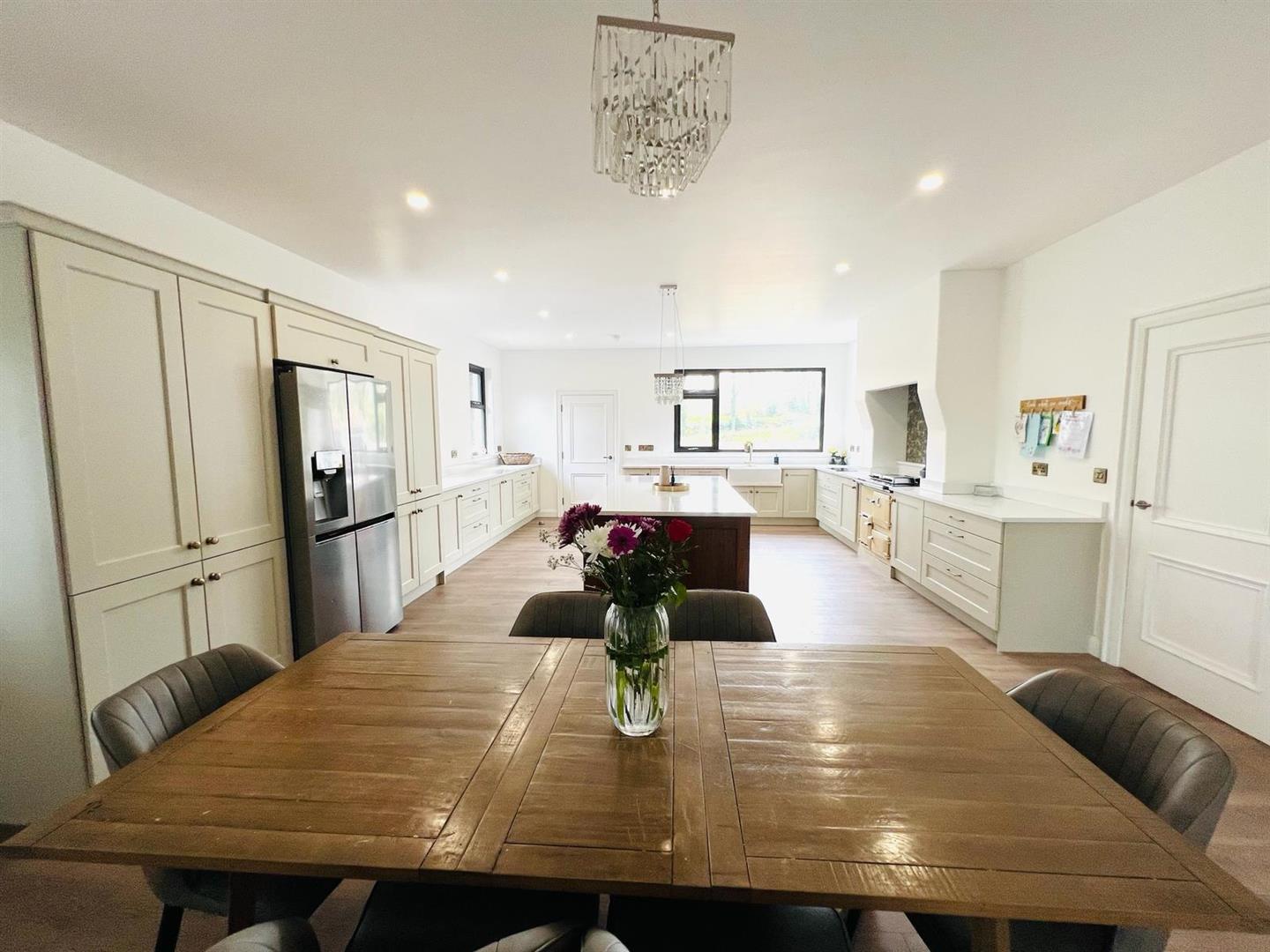 8.64m x 5.44m (28'4" x 17'10") - Having excellent range of eye and low level units, 'Rayburn' oil stove, 'Belfast' double sink with mixer taps, hob, oven, Downdraft extractor fan, space for American style fridge/freezer, centre island with cooker, integrated dishwasher and bins, pantry cupboard, 'Quartz' worktop and splashback, breakfast bar, ample dining space, recessed lighting, laminated flooring, double doors to Sun Room.