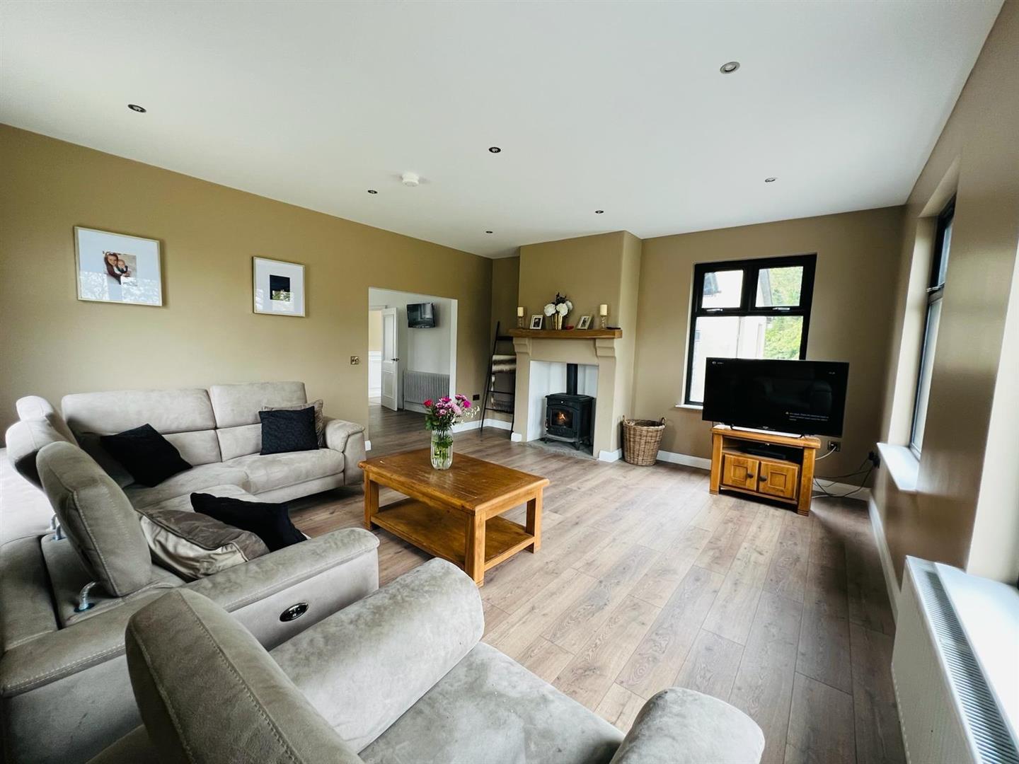 5.44m x 4.83m (17'10" x 15'10") - Dual aspect. Having multi fuel stove, recessed lighting, laminated wooden floor, open plan to Kitchen.