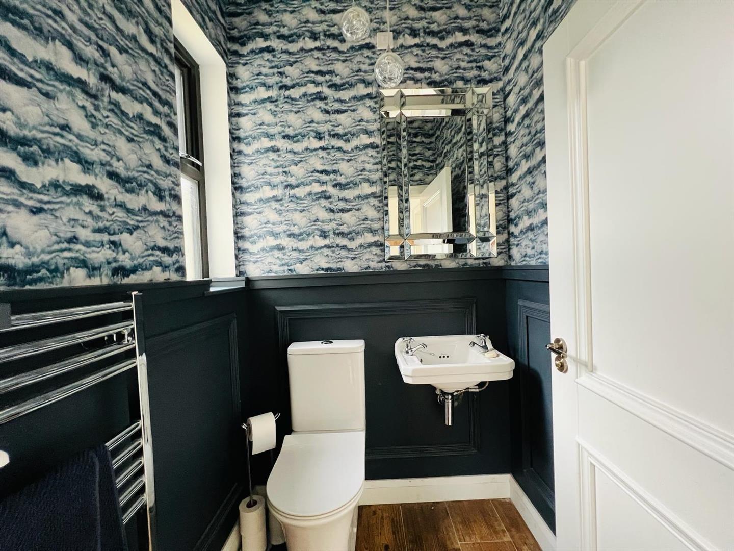 Having 1/2 height wooden panelled walls, tiled floor, chrome radiator.