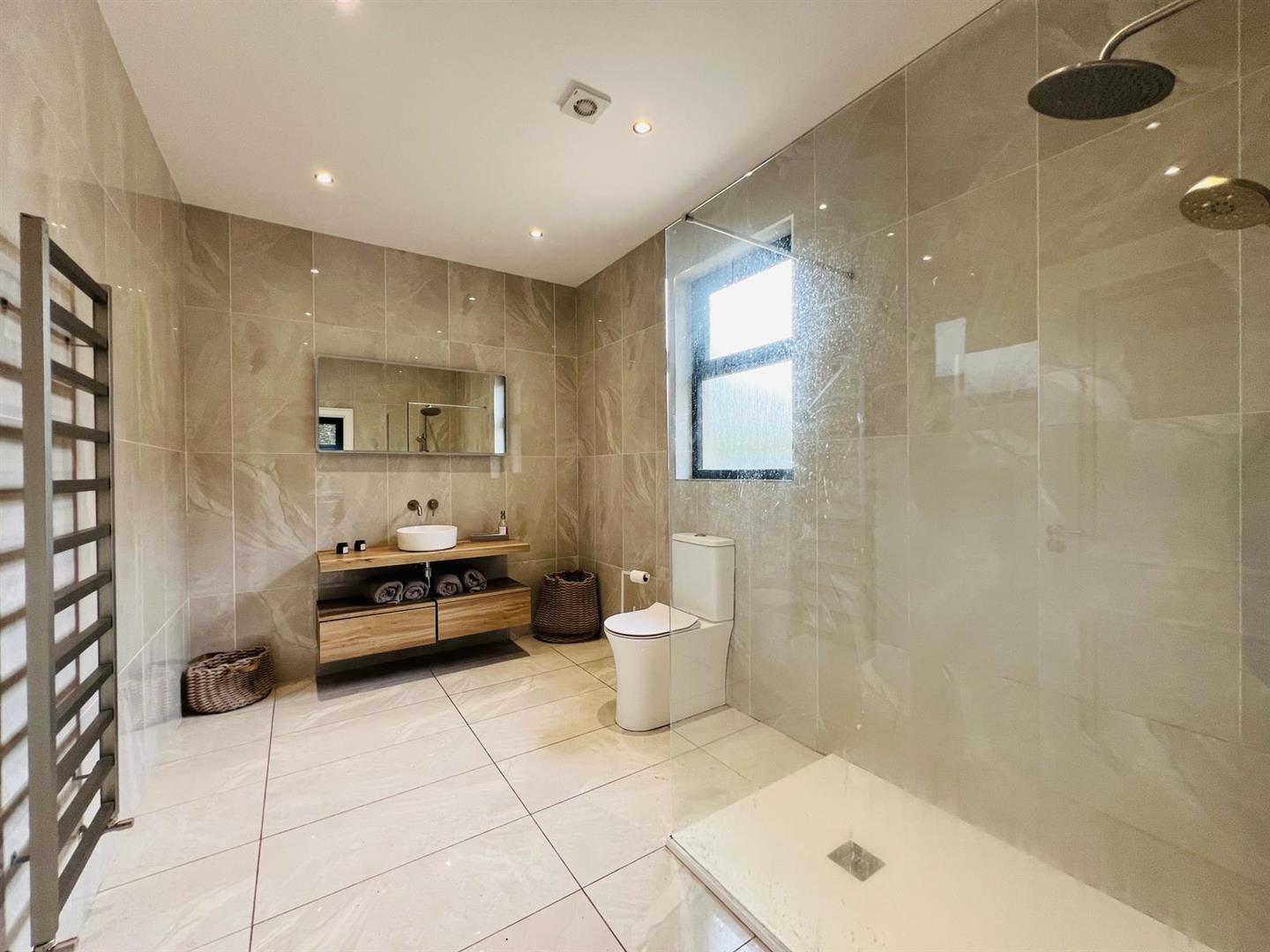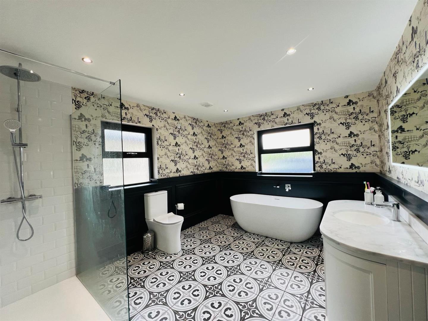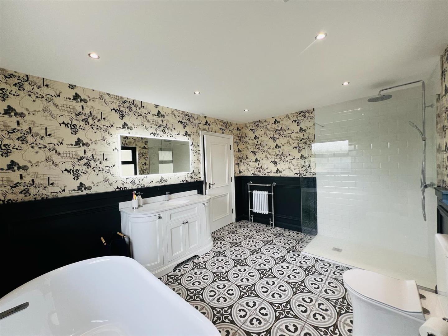 Comprising free standing bath, walk in fully tiled shower, whb set in vanity unit with 'Quartz' worktop, wc, recessed lighting, 1/2 height wooden panelled walls, tiled floor.