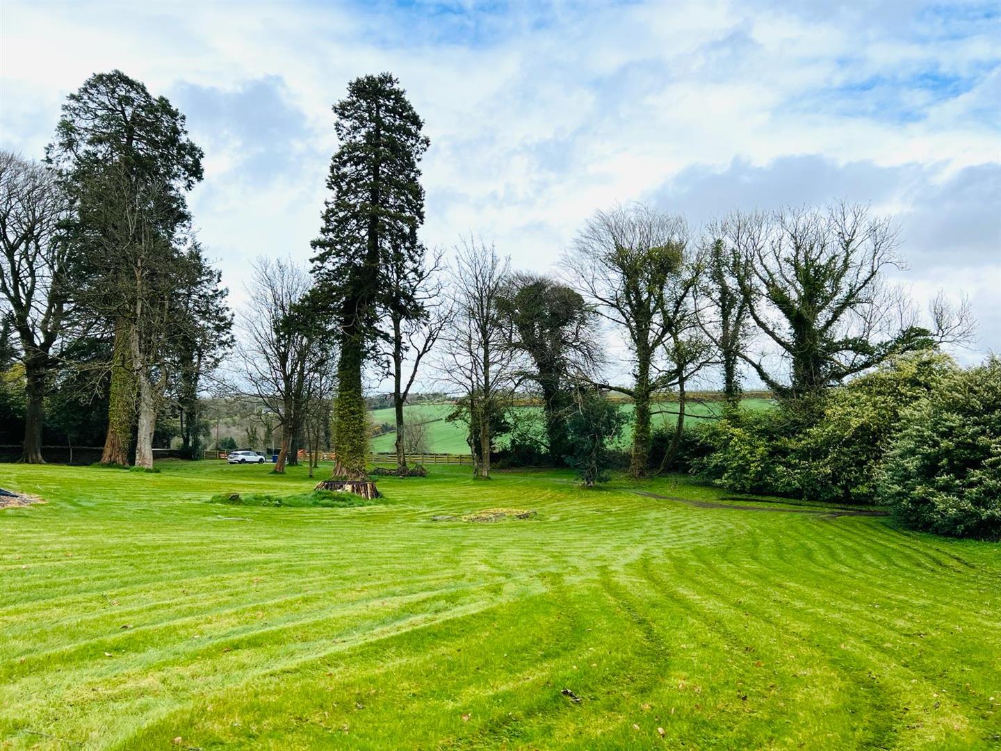 Extensive lawns to front and side stocked with mature trees.