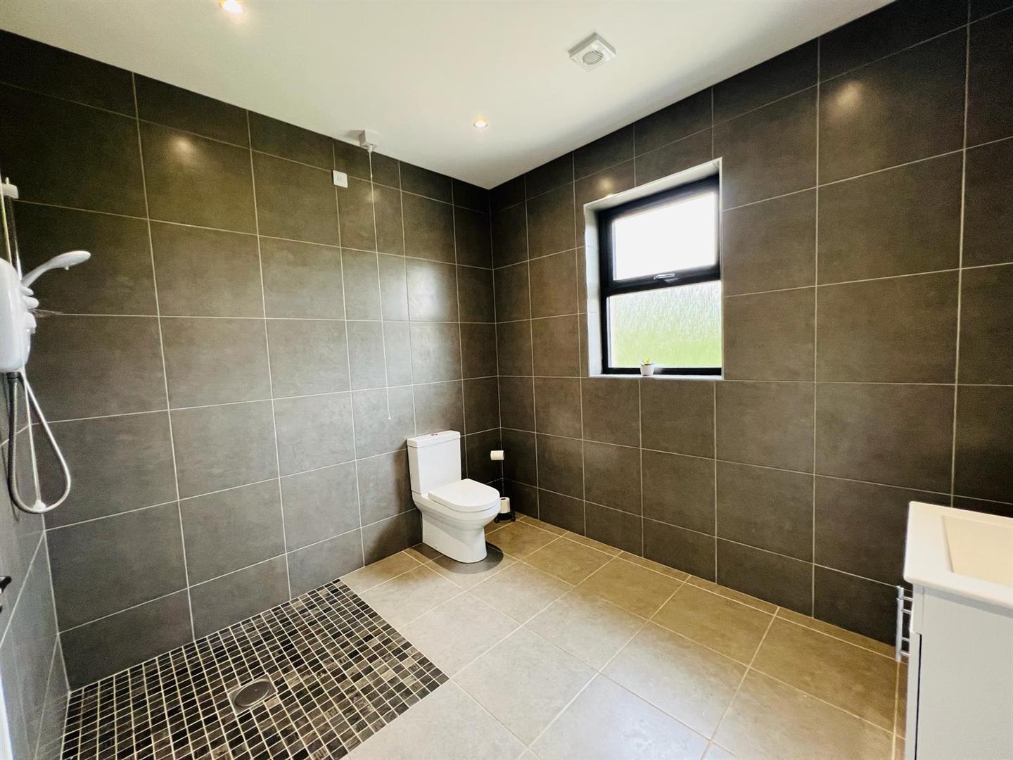 Comprising walk in electric shower, whb set in vanity unit, wc, chrome radiator, fully tiled walls and floor.