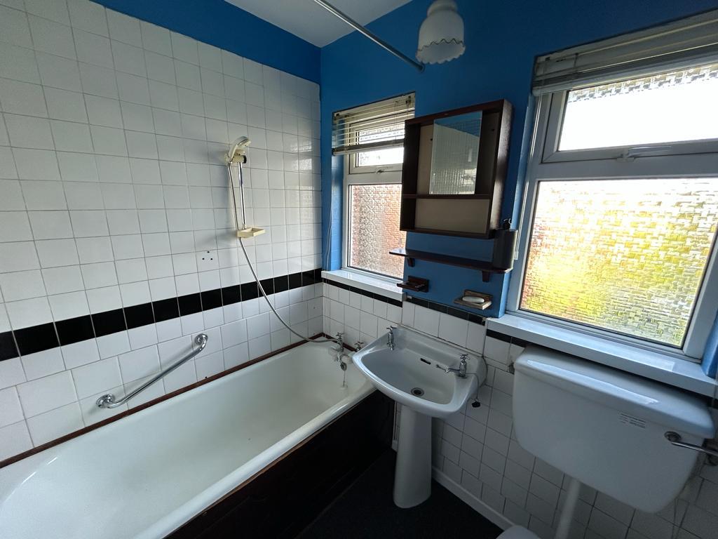 Comprising bath with shower fitting to taps and tiling around, whb and wc.