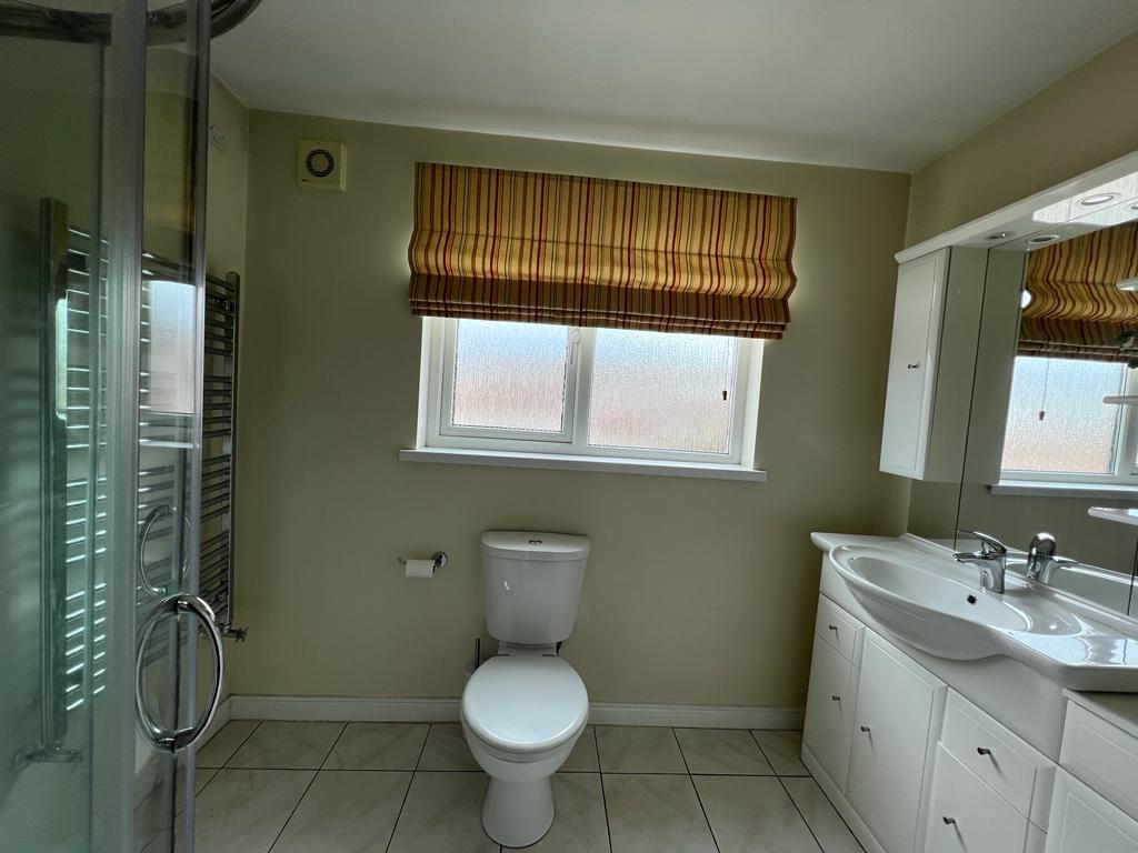 Comprising fully tiled walk in shower, whb set in vanity unit, wc, chrome radiator, tiled floor.