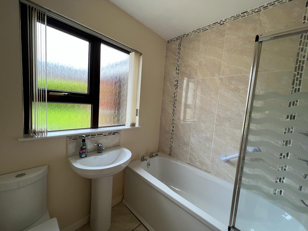 Comprising bath with shower over, shower screen, whb and wc, partly tiled walls, tiled floor.