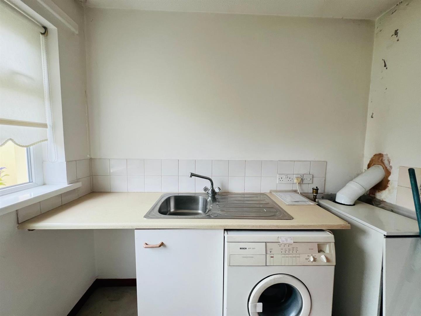 Having sink unit, plumbed for washing machine, tiled floor.