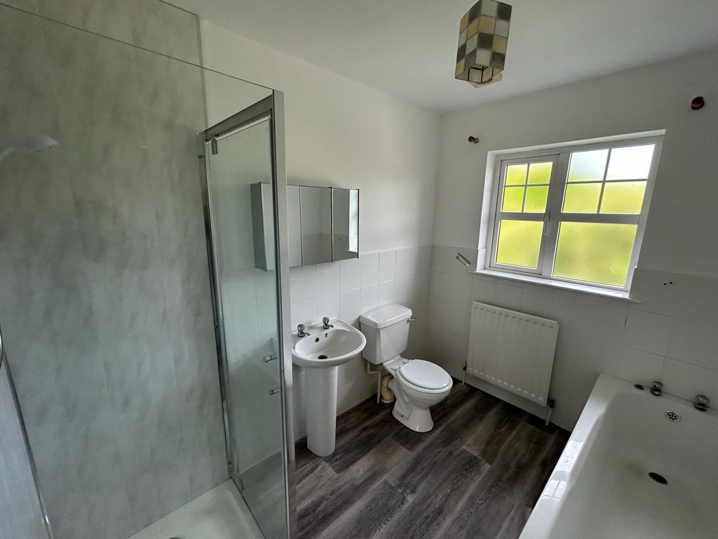 Comprising bath, whb and wc, walk in electric shower with PVC cladding to walls, extractor fan.