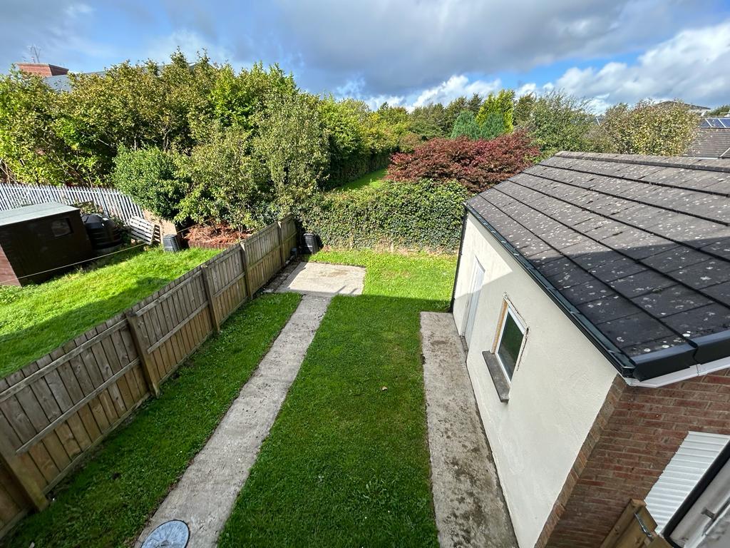Lawn to rear bordered by fence, hedge and gate.