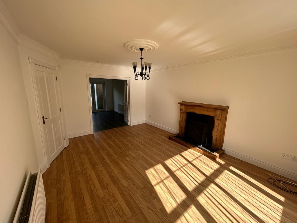 5.54m x 3.68m into bay (18'2" x 12'1" into bay) - Having tiled fireplace with wooden surround and tiled hearth, ceiling cornicing and centre rose, double doors to kitchen, laminated wooden floor.