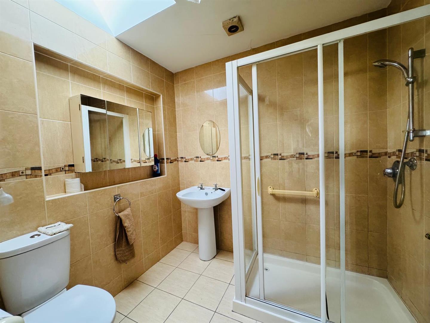 Comprising walk in shower, whb and wc, tiled walls and floor.