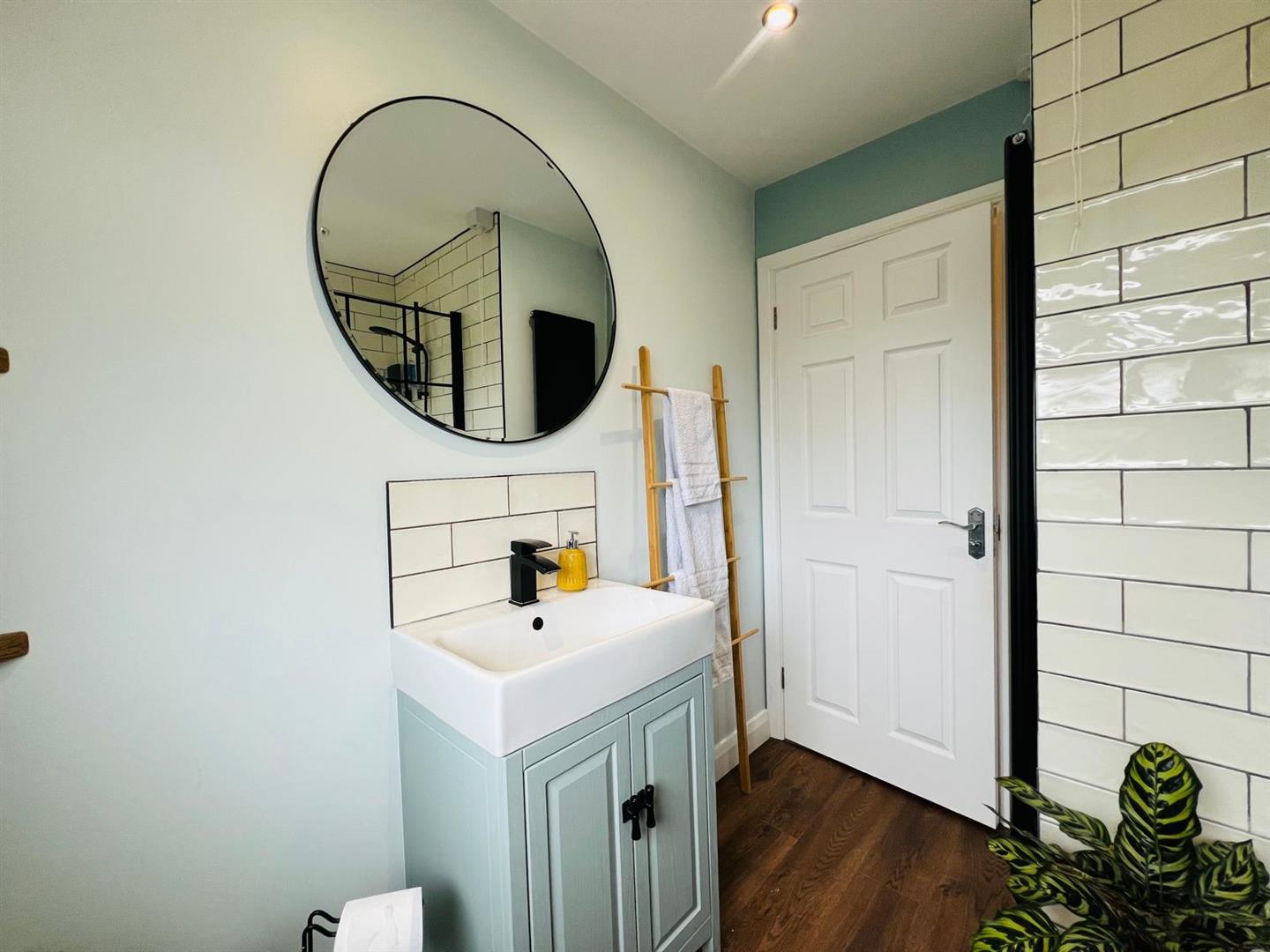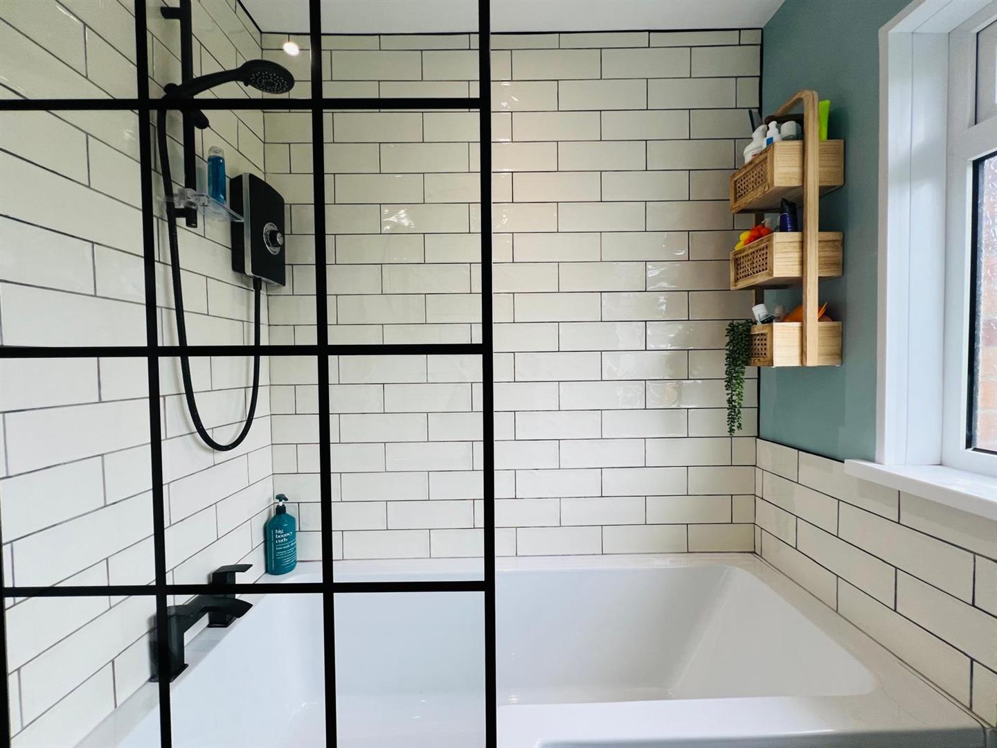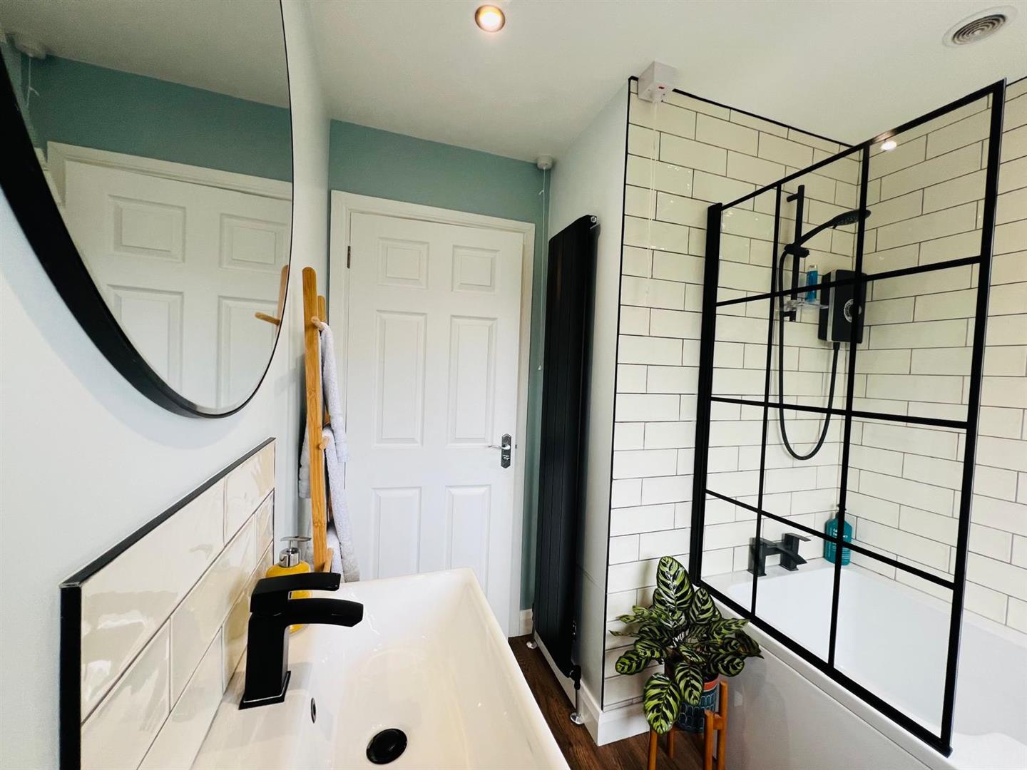 Comprising bath with tiling around and electric shower over, shower screen, whb set in vanity unit, wc, feature wall radiator, recessed lighting, laminated wooden floor.