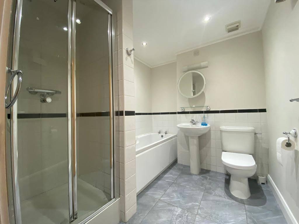 Comprising bath with tiling around, whb and wc, fully tiled walk in shower, extractor fan, ceiling cornicing, recessed lighting, tiled floor.