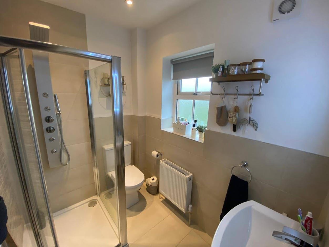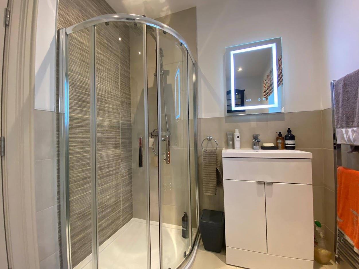 Comprising fully tiled walk in shower, whb and wc, extractor fan, recessed lighting, Bluetooth mirror, extractor fan, tiled floor.