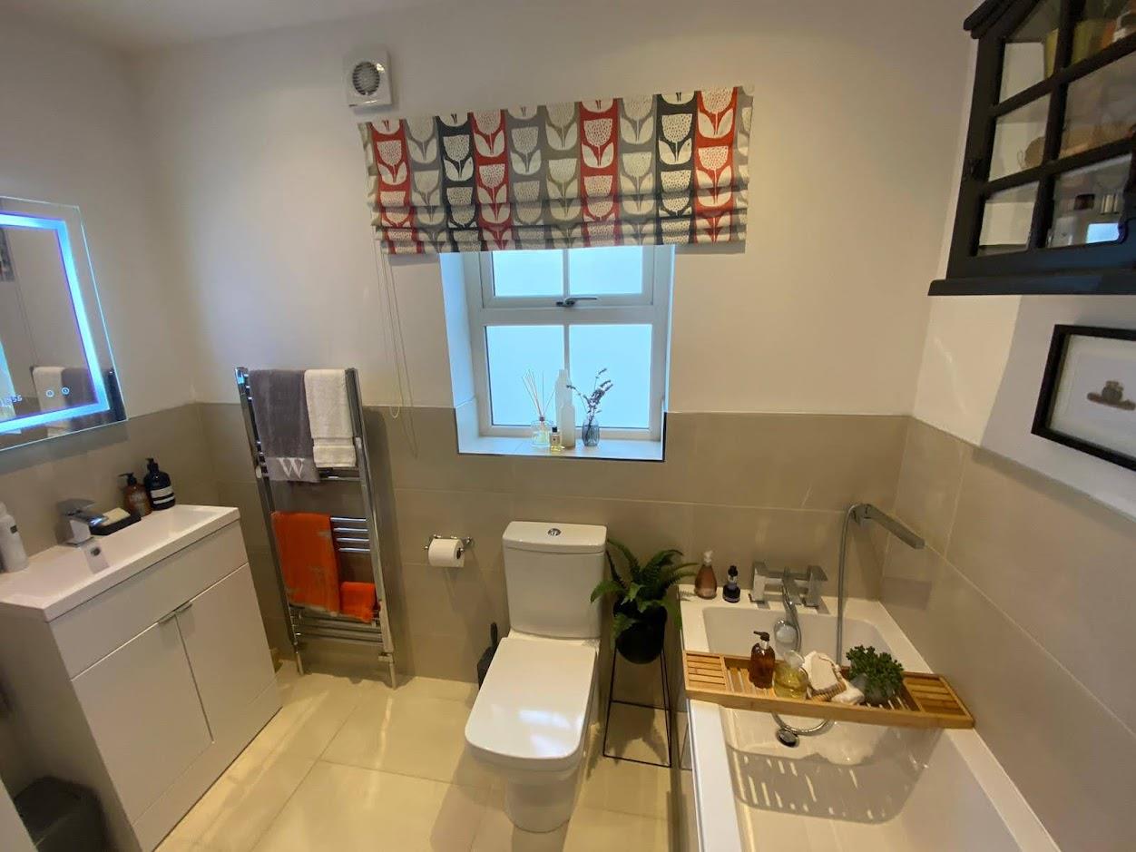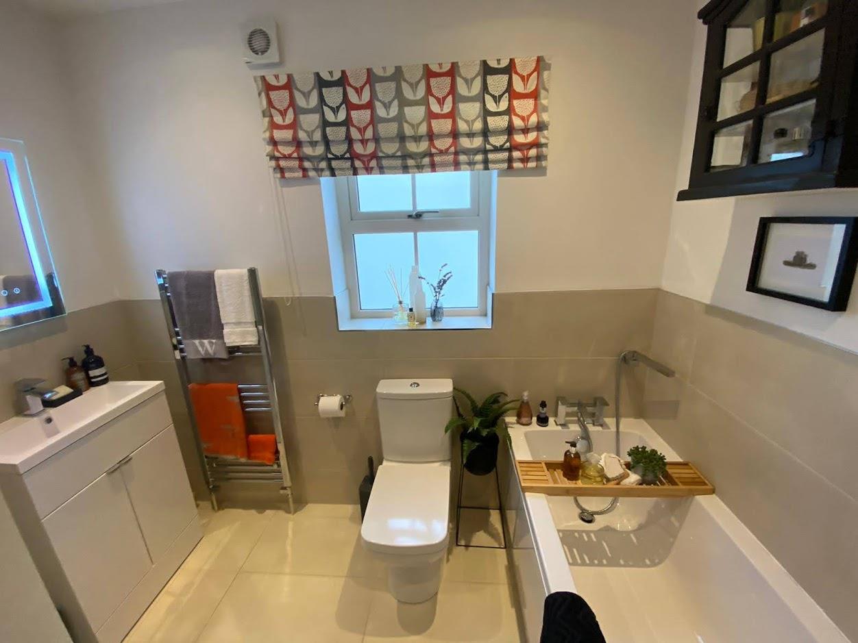 Comprising bath with shower attachment to taps, whb vanity unit, wc, fully tiled walk in shower, Bluetooth mirror, partly tiled walls, tiled floor.