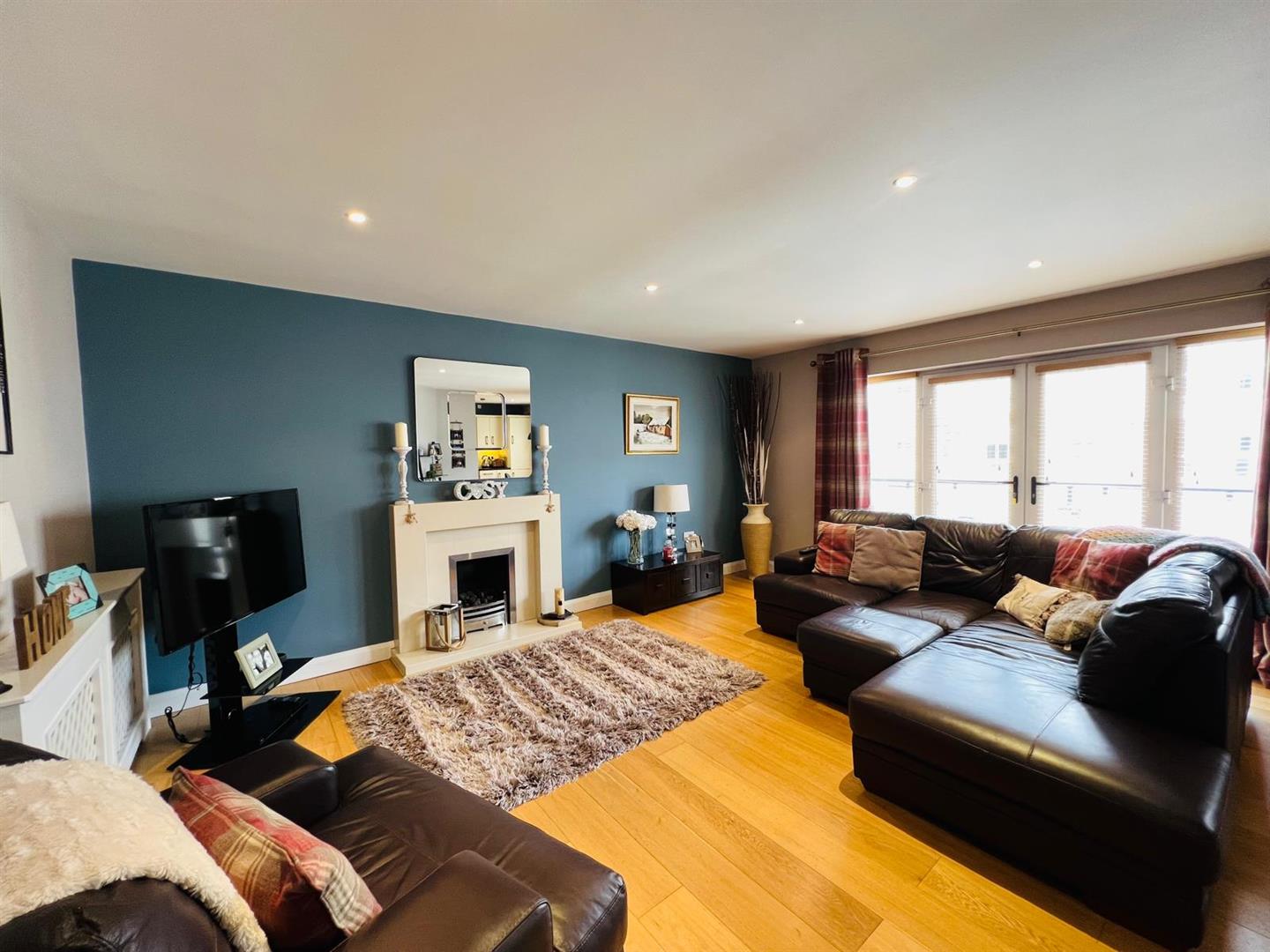 8.18m x 5.51m wp (26'10" x 18'1" wp) - Having attractive fireplace with gas fire, wooden floor. French doors to Balcony, Kitchen area having range of eye and low level units with concealed lighting under, 1 1/2 bowl stainless steel sink unit with mixer taps, gas hob, electric underoven, stainless steel extractor hood, plumbed for washer/dryer, integrated fridge/ freezer and dishwasher, recessed lighting, dining space.