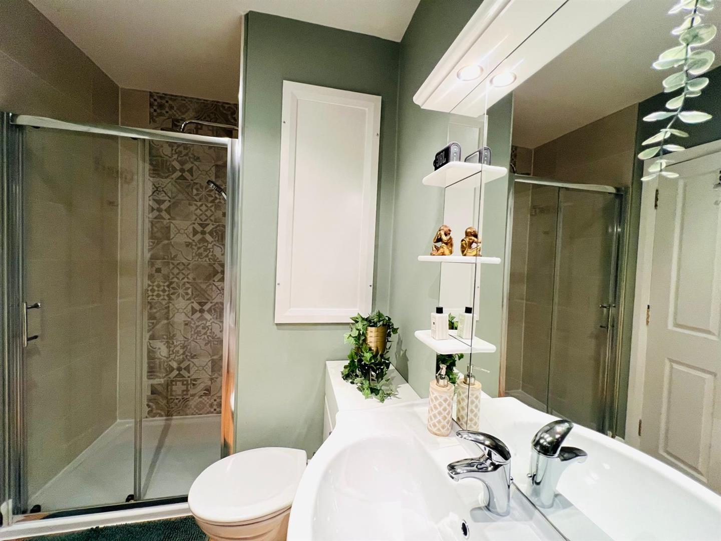 Comprising fully tiled walk in shower, whb and wc, tiled floor.