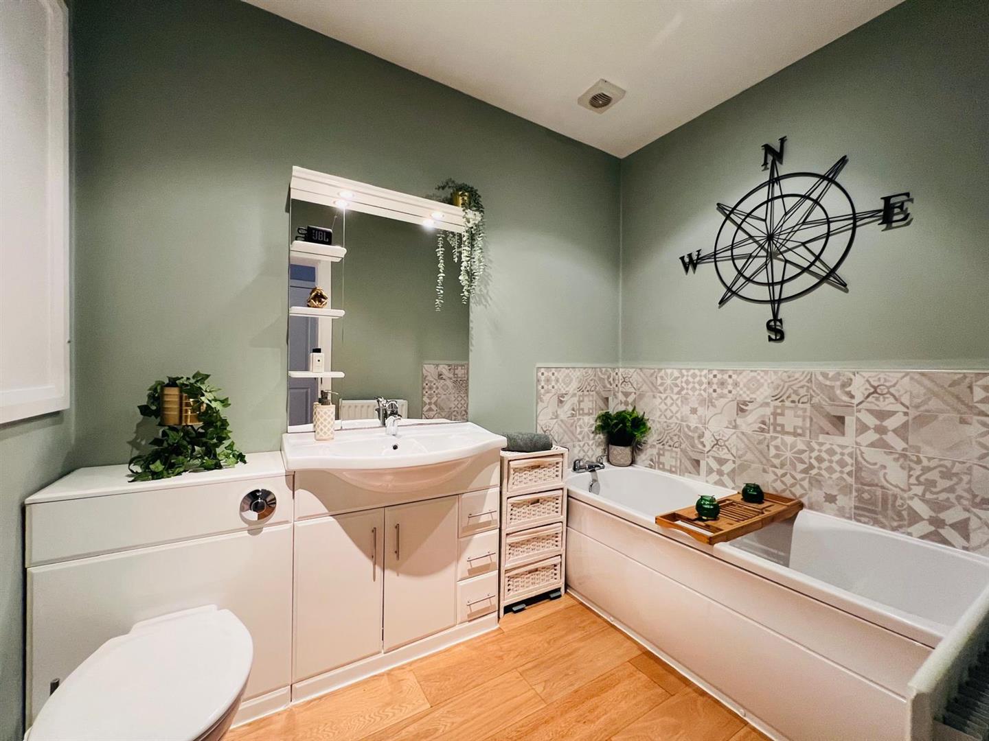 Comprising bath with tiling around, fully tiled walk in shower, whb set in vanity unit, wc, recessed lighting, wooden floor.