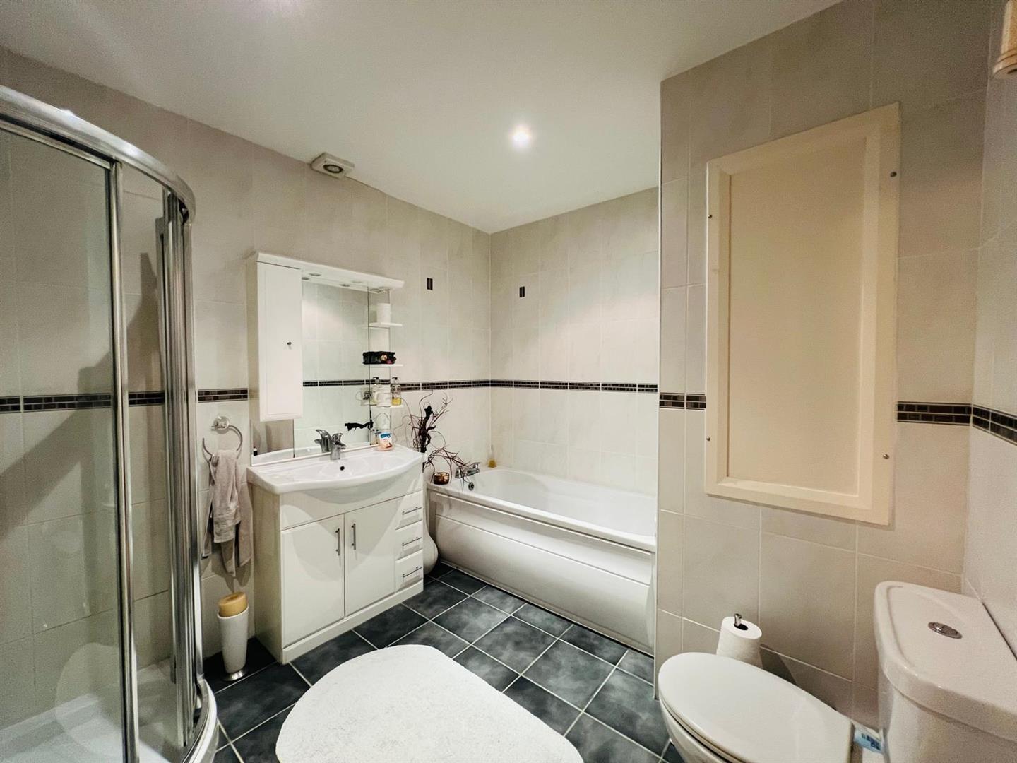 Comprising bath, walk in shower, whb set in vanity unit, wc, fully tiled walls, tiled floor.