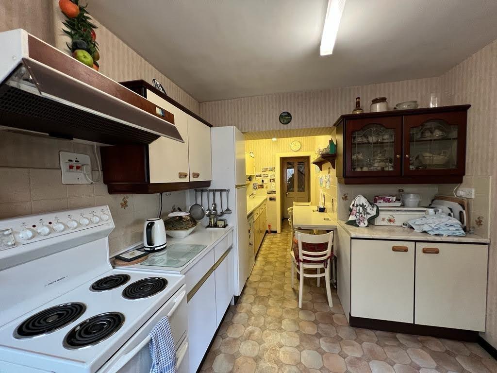 7.62m x 2.69m wp (25' x 8'10" wp) - Having eye and low level units, single drainer stainless steel sink unit with mixer taps, wired for cooker, space for fridge, plumbed for dishwasher, larder.