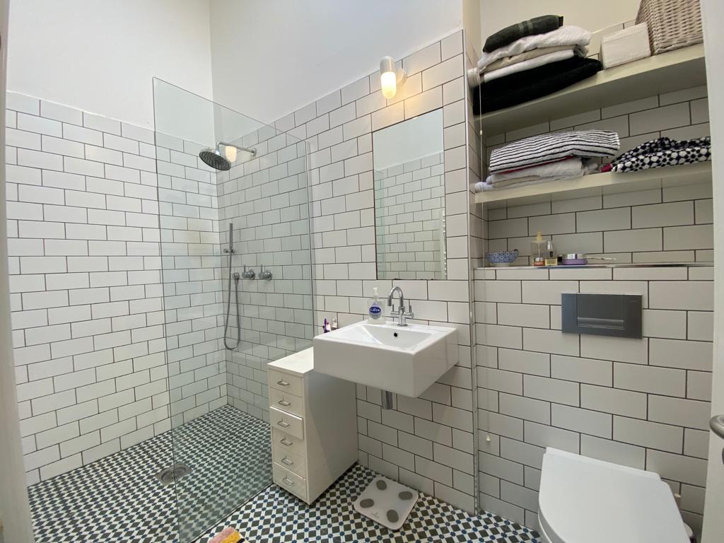 Comprising shower, whb set in vanity unit, wc, chrome radiator, recessed lighting.