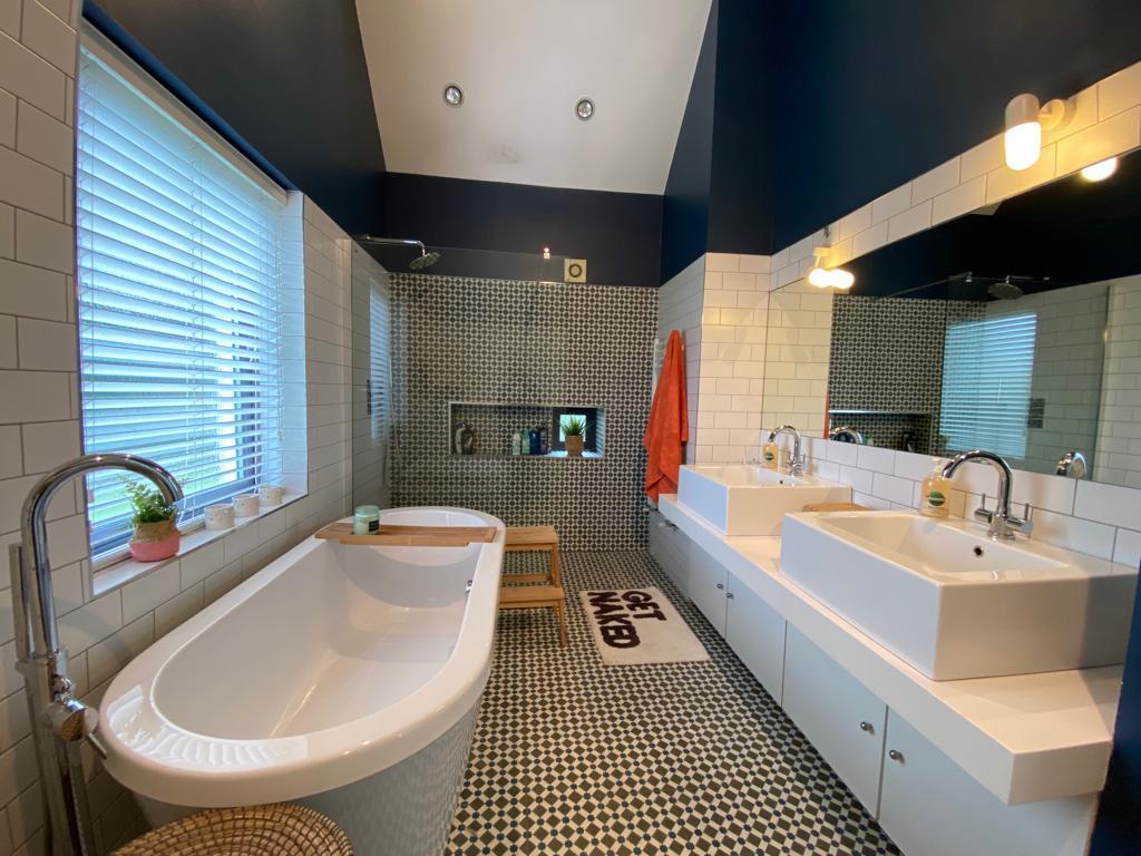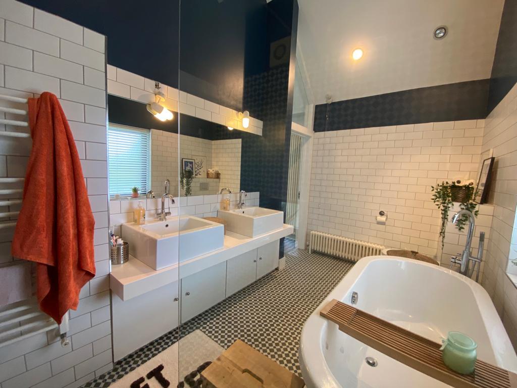 Comprising bath, shower, ‘His and Her’ wash hand basins with storage under, wc, recessed lighting, partly tiled walls, tiled floor.