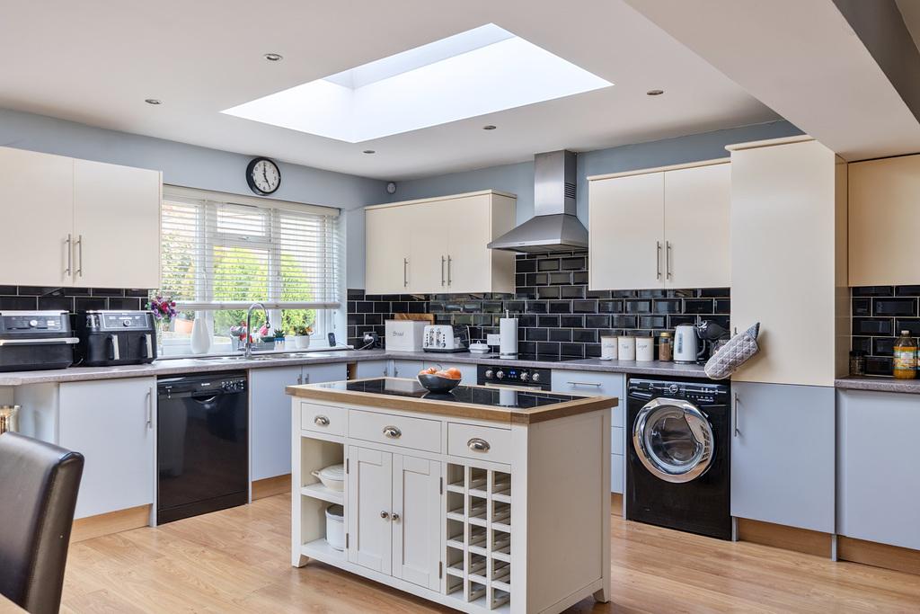 The ground floor comprises a spacious entrance hall with under-stairs storage and a contemporary shower room, a generous sitting room tastefully decorated and filled with natural light, and a stunning open-plan kitchen, dining and family area to the rear. This impressive space forms the heart of the home, featuring modern cabinetry, integrated appliances, a central island, and ample space for both dining and relaxation. Skylights and French doors provide plenty of natural light and open directly onto the garden, creating a seamless indoor-outdoor feel. Upstairs, the property offers three well-proportioned bedrooms and a family bathroom.