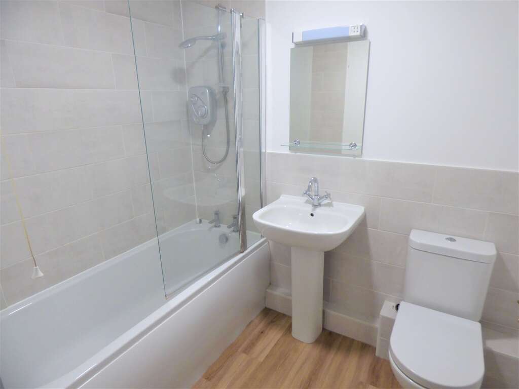Matching suite comprising: panel enclosed bath with wall mounted 'Triton' shower & glass screen, pedestal wash hand basin & low level WC. Heated towel rail. Part tiled walls with mirror, light and shaved point. Extractor.