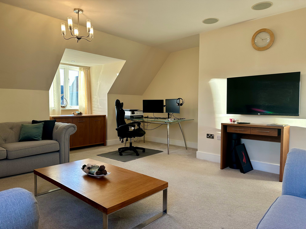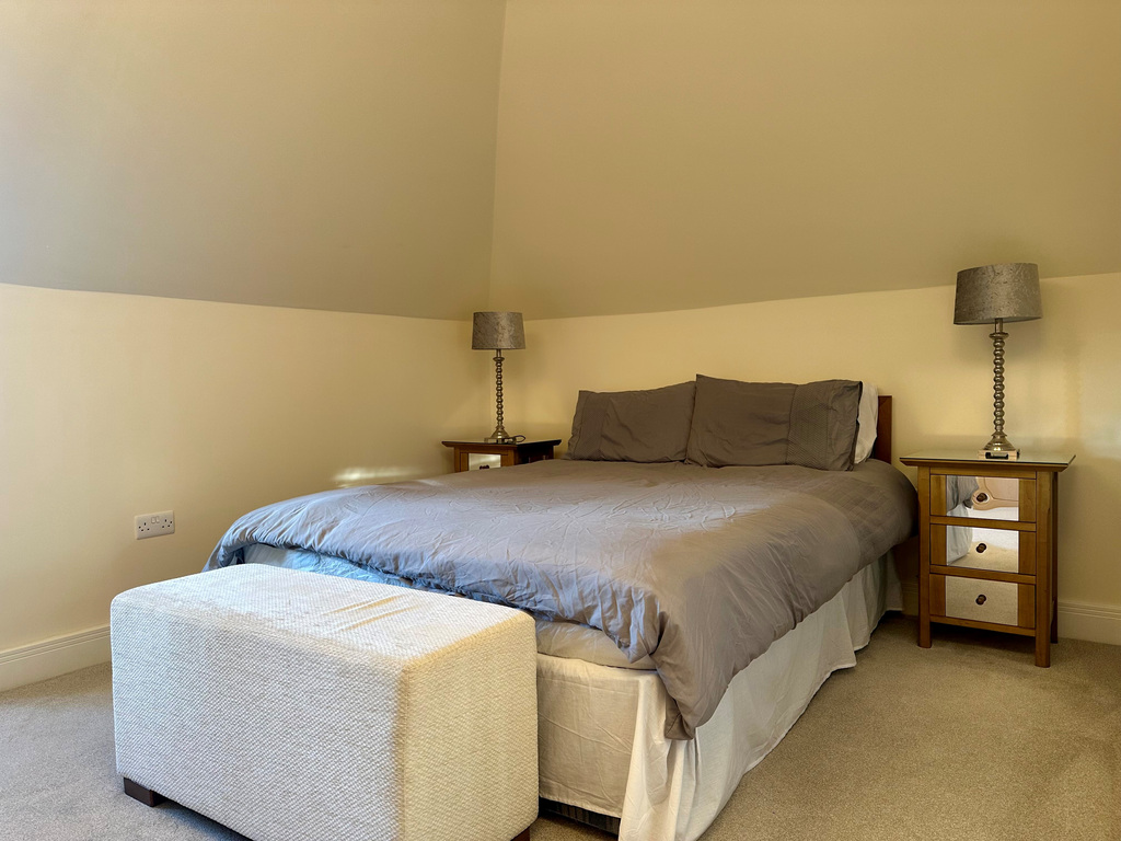 The stunning main bedroom offers a peaceful retreat, complete with built-in wardrobes and a contemporary en-suite shower room. A further double bedroom provides excellent flexibility for guests, family, or working from home. The sizeable family bathroom is beautifully finished, complementing the overall sense of quality throughout.