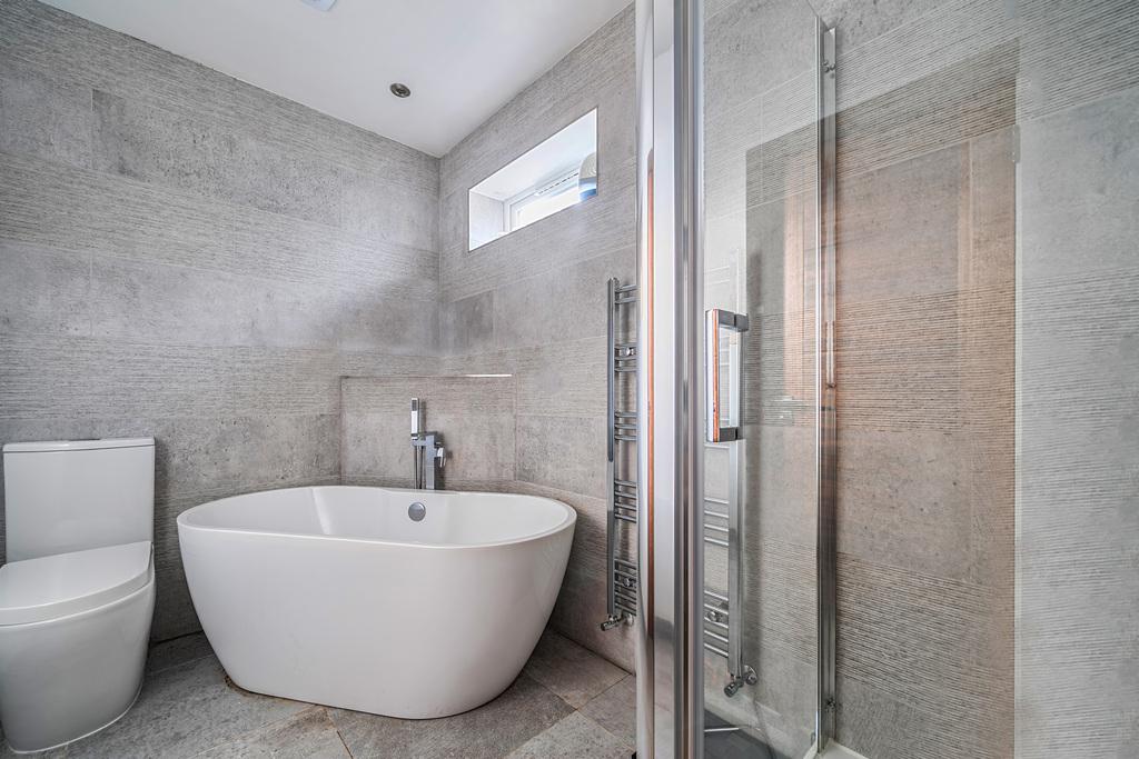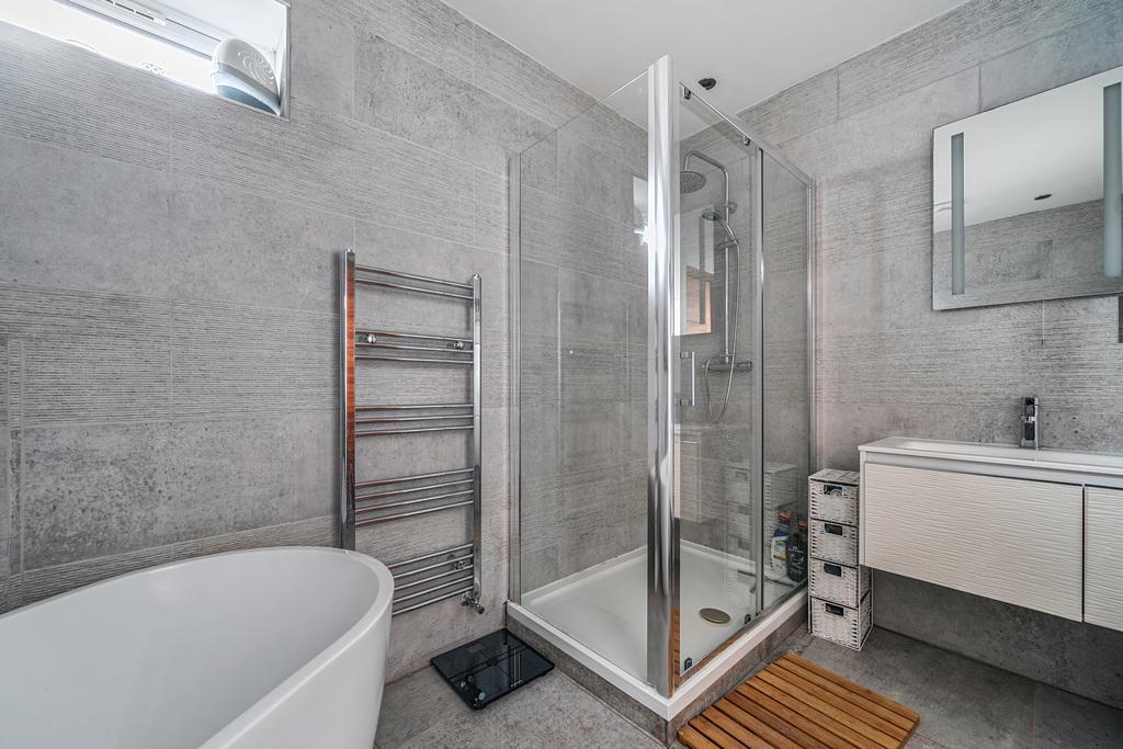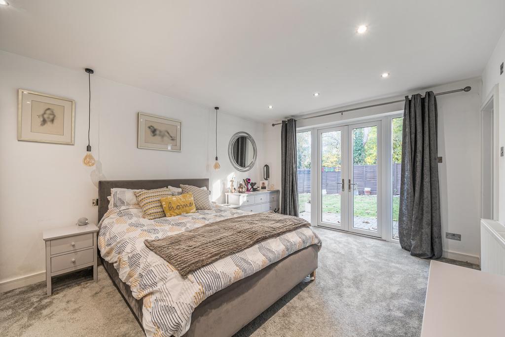 The property offers four bedrooms, including a spacious principal suite with French doors leading directly to the garden and a stylish en suite bathroom. Bedroom two also benefits from its own en suite shower room, while the remaining bedrooms are served by a well-appointed family bathroom with both a freestanding bath and a separate walk-in shower.