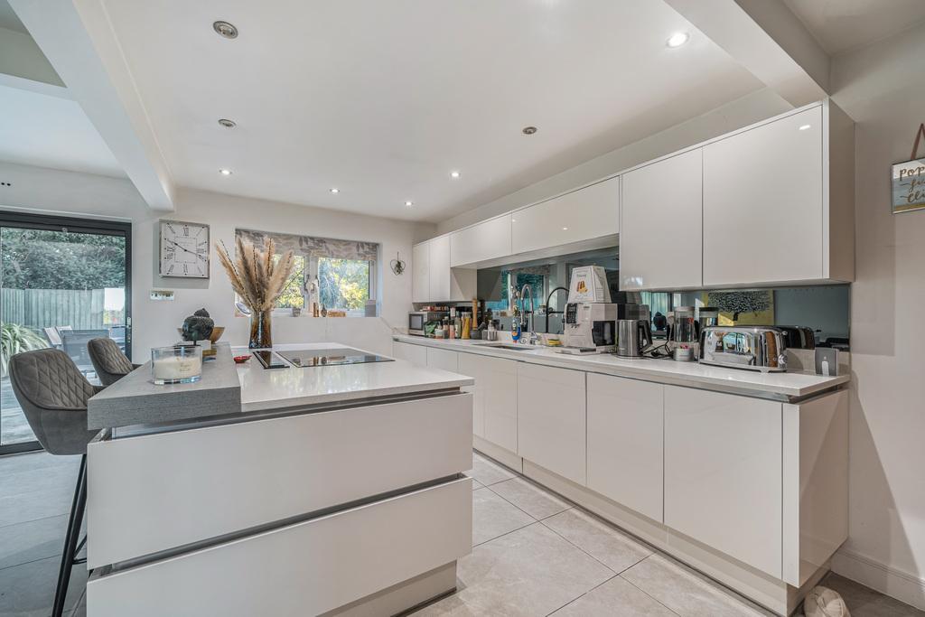 At the heart of the home is a superb open-plan kitchen/dining room, an impressive and sociable space ideal for both everyday family life and entertaining. Large windows and bi-fold doors fill the area with natural light and provide direct access to the garden. The kitchen features modern cabinetry, integrated appliances, and a central island with breakfast bar, while the adjoining dining area offers ample room for hosting.