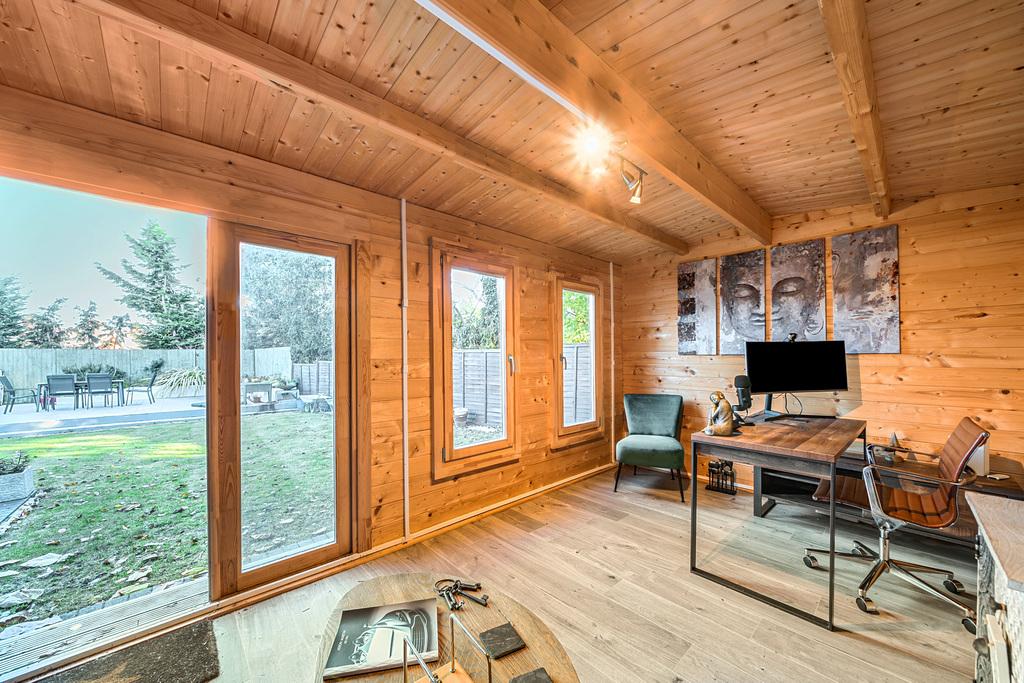 The private rear garden features a large patio area ideal for outdoor dining, with a useful outbuilding currently used as a home office — complete with power, making it a versatile workspace or hobby room.