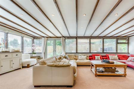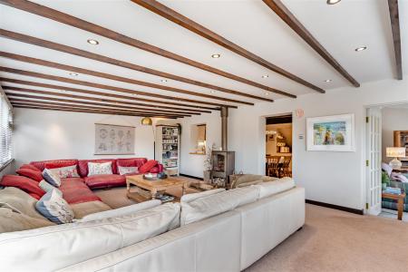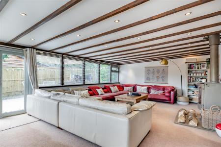Family Room / Sun Room - 7.19m x 4.45m (23'7 x 14'7) - Double opening French doors to side aspect leading to patio and seating area, large log burner, double radiator, inset spotlighting, front and side aspect windows. Step leads down into: