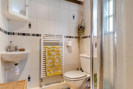Shower Room - 1.60m x 1.57m (5'3 x 5'2) - Corner shower cubicle with inset Mira shower system, WC, wash hand basin, tiled walls, inset spotlighting, heated towel rail, rear aspect frosted window.