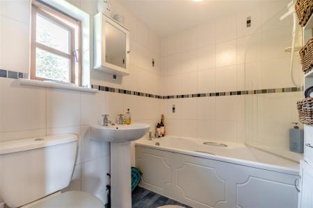 Bathroom - 2.03m x 1.75m (6'8 x 5'9) - Panelled bath with Mira Sports shower over, pedestal wash hand basin, WC, fully tiled walls, heated towel rail, rear aspect window.