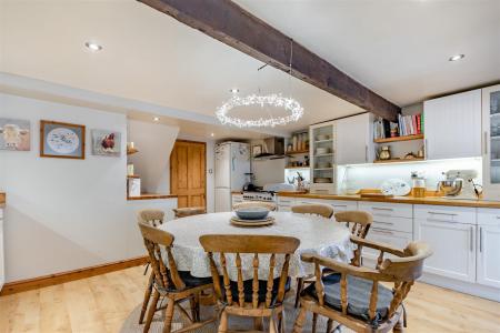 Kitchen / Breakfast Room - 5.03m x 4.75m (16'6 x 15'7) - Farmhouse style kitchen comprising of a range of base and wall mounted units with wooden worktops and splashbacks, one and a half bowl sink with mixer tap, plumbing for washing machine, space for tumble dryer, Rangemaster oven with five ring gas hob, space for tall fridge / freezer, plumbing for dishwasher, wood laminate flooring, inset spotlighting, exposed beams, double radiator, former window opening and door opening through to: