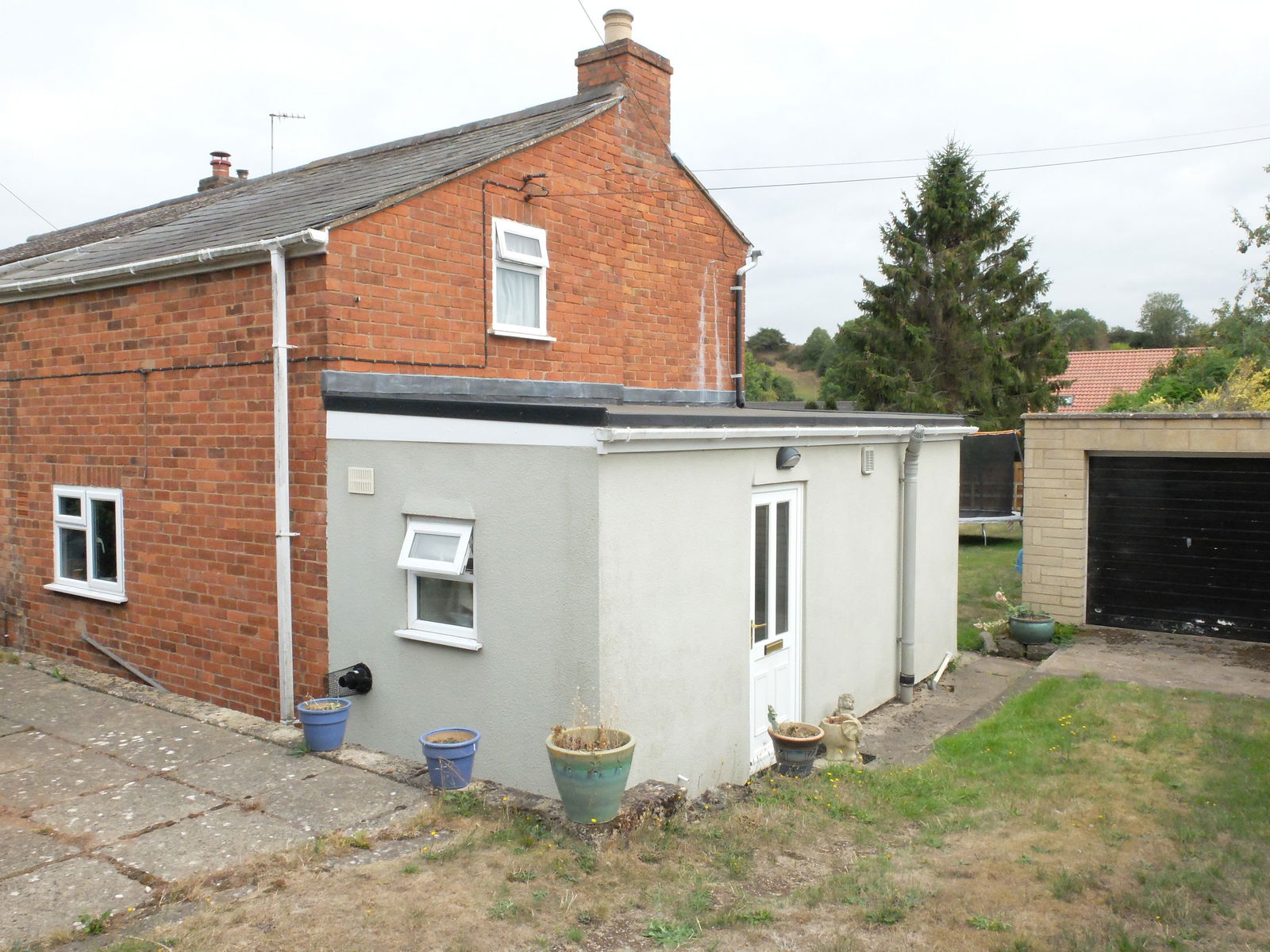 A useful space with A half brick wall and quarry tiled flooring with single glazed windows and obscure single glazed door onto the garden.