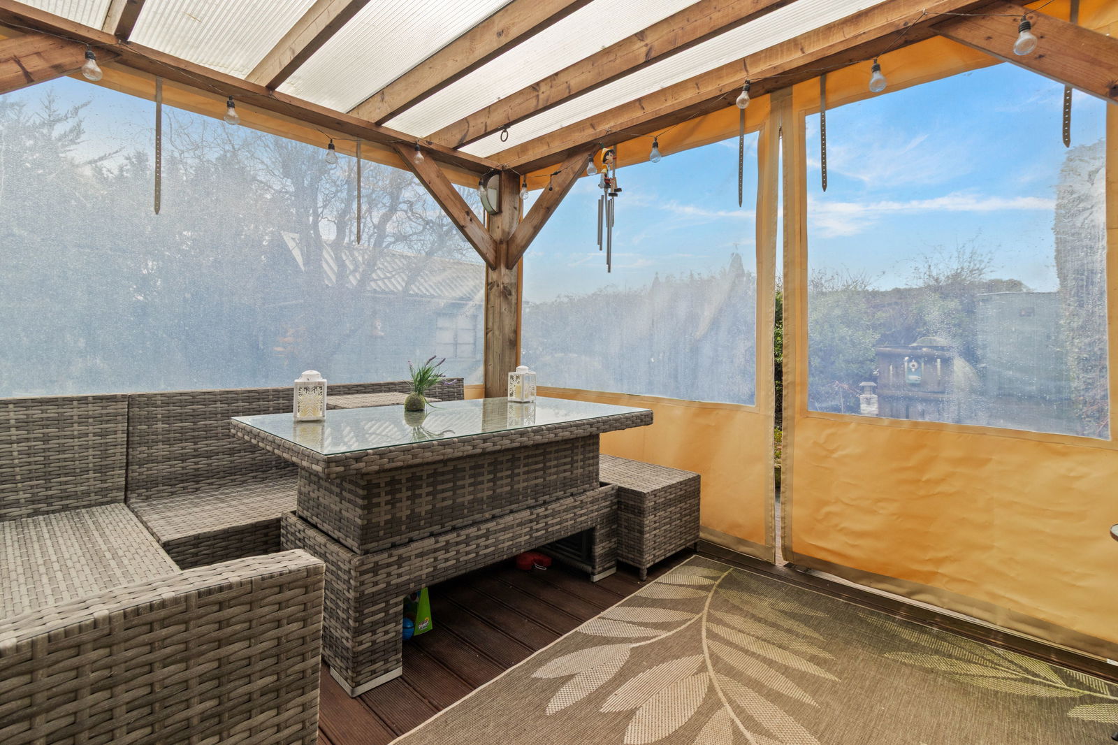 An attractive brick pathway leads from the driveway to the property where there is a large paved terrace and feature raised decking with pergola. To one side there is a lawned garden area with slate beds and further stone terracing and decking to the rear.