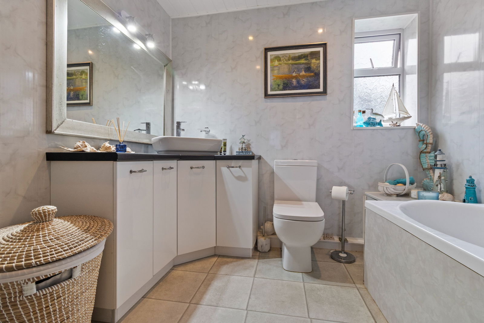 Fitted with a contemporary white suite comprising a panelled bath with shower over and folding shower screen, mounted wash basin with tower tap and cupboards under, and a WC. Radiator. Panelled ceiling. Access to roof space. Attractive wooden door.