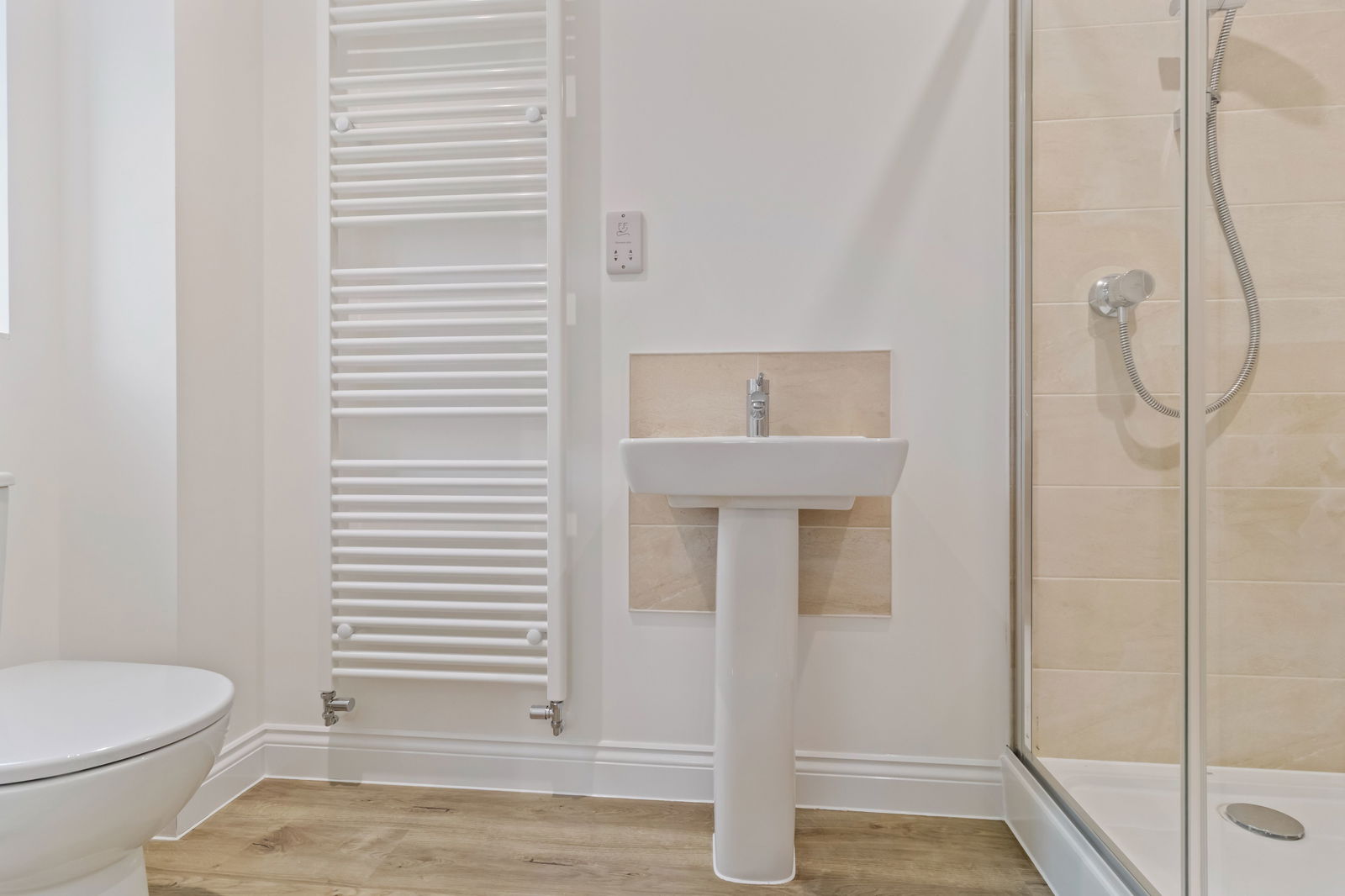 Geberit contemporary white sanitaryware with vanity unit. Bristan chrome mixer taps. Mira shower enclosure with Mira water efficient shower. Shaver socket.